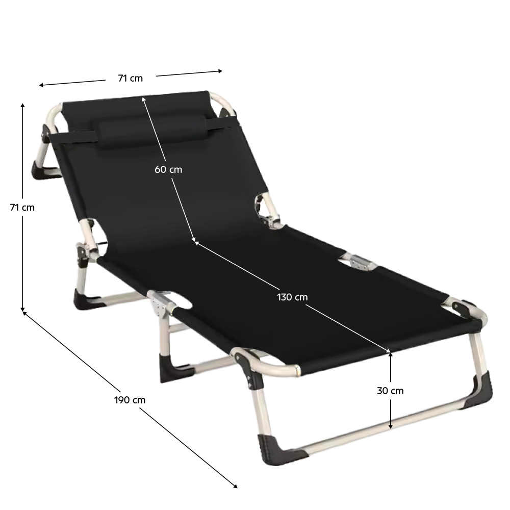 Materiál: ocel/látka Oxford Oděruodolnost látky podle testu Martindale: 7 600 oděrů Barva: béžová/černá Rozměry (ŠxHxV): 71x190x71 cm Výška sedu: 30 cm Hloubka sedu: 130 cm Šířka sedu: 71 cm Výška zádové opěrky: 60 cm Šířka zádové opěrky: 71 cm Nosnost: 100 kg Hmotnost: 5,5 kg Zahradní Skládací Opěrka hlavy Voděodolná tkanina Praktické Moderní design Dodáváno v monte