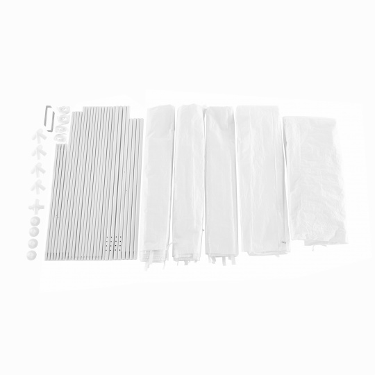 Materiál: 100% polyethylen / ocel Barva: bílá Rozměry (ŠxHxV): 300x900x250cm nepromokavý 8 bočních stěn 6 průhledných oken na každé stěně kromě vchodu Dvě stěny se zipem (vchod) Boční stěny snímatelné Odolný vůči UV záření Ochrana před slunečním zářením a lehkým deštěm Nevystavujte ho nepříznivým povětrnostním podmínkám Dodávané v demontu