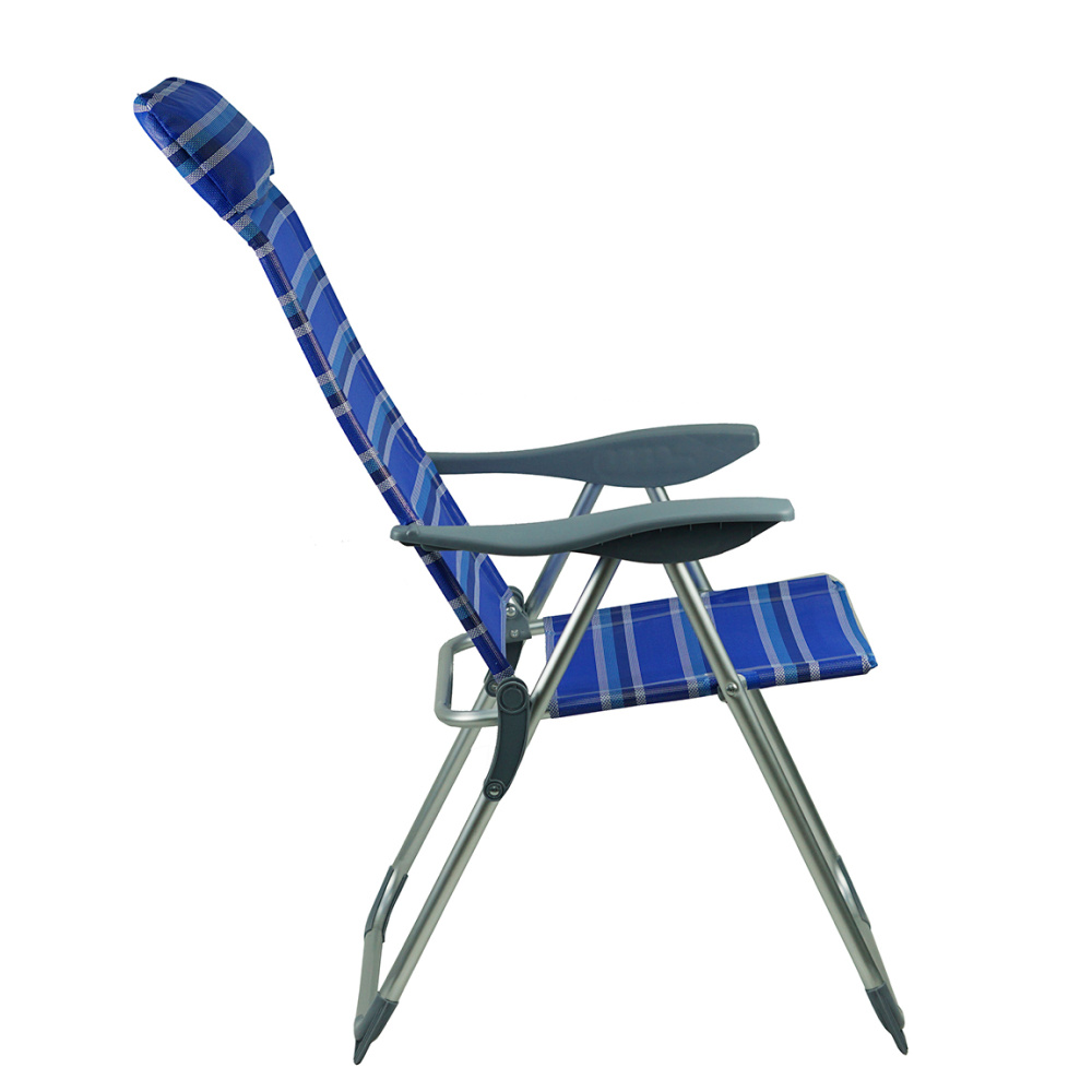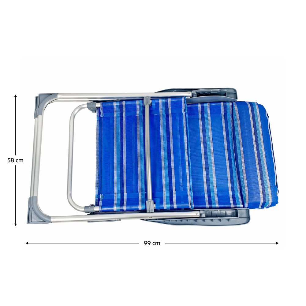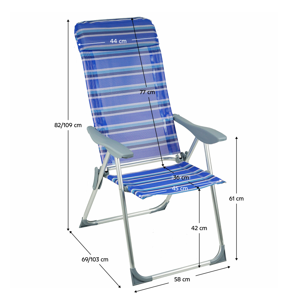 Materiál: hliník/plast/polyester Barva: modrá/šedá Rozměry (ŠxHxV): 58x69/103x82/109 cm Rozměry složené křeslo (ŠxHxV): 99x58x8 cm Výška sedu: 42 cm Hloubka sedu: 36 cm Šířka sedu: 45 cm Šířka opěrky zad: 44 cm Výška opěrky zad: 77 cm Výška opěrky na ruku: 61 cm Nosnost: 90 kg Hmotnost: 3,75 kg Polohovací 5 poloh Plastové područky Plastové krytky na spodní konstrukci Vhodné na zahradu, terasu, k bazénu Jednoduchá manipulace a přesun Dodáváno v monte