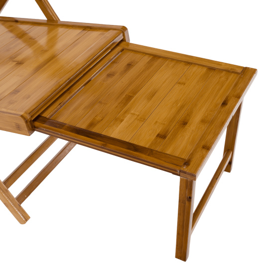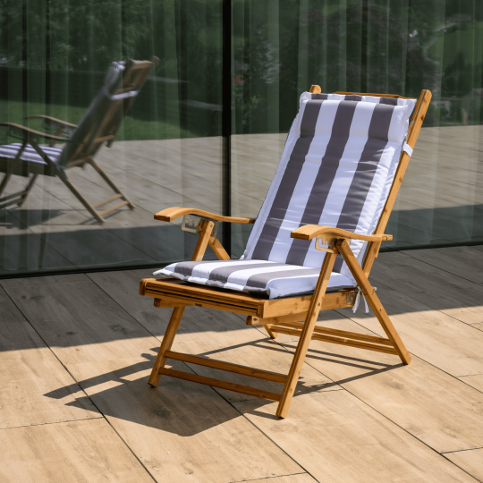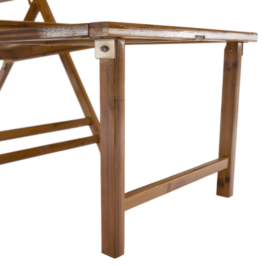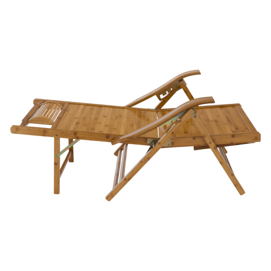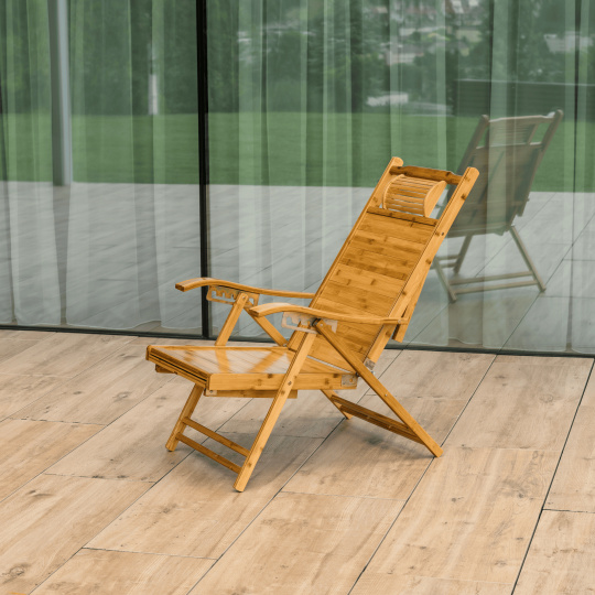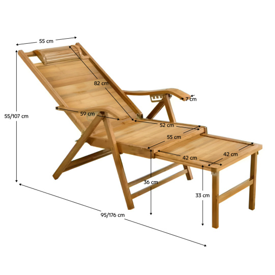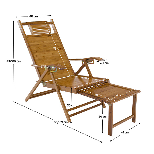 Materiál: masivní bambusové dřevo Barva: přírodní Rozměry (ŠxHxV): 61x85-169x43-100 cm Výška sedu: 36 cm Hloubka sedu: 52 cm Šířka sedu: 48 cm Výška zádové opěrky: 78 cm Šířka zádové opěrky: 48 cm Nosnost: 100 kg Hmotnost: 13 kg Zahradní Skládací Polohovací 5 úrovní polohování Opěrka hlavy S područkami Křeslo Lehátko S výsuvnou podnoží Rozměry podnož (ŠxH): 43x38 cm Praktické Moderní design Dodáváno v montě