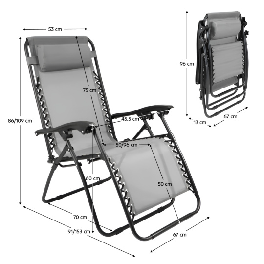 Materiál: umělá textilie/ocel Barva: světle šedá/černá Rozměry (ŠxHxV): 67x91/153x86/109 cm Rozměry po složení (ŠxHxV): 67x13x96 cm Výška sedu: 50 cm Hloubka sedu: 50/96 cm Šířka sedu: 45,5 cm Šířka opěrky zad: 53 cm Výška opěrky zad: 75 cm Výška opěrky na ruku od země: 60 cm Nosnost: 100 kg Hmotnost: 5,75 kg Skládací Polohovací S 5 stupni polohování Měkká opěrka hlavy Praktické Moderní design Dodáváno v monte