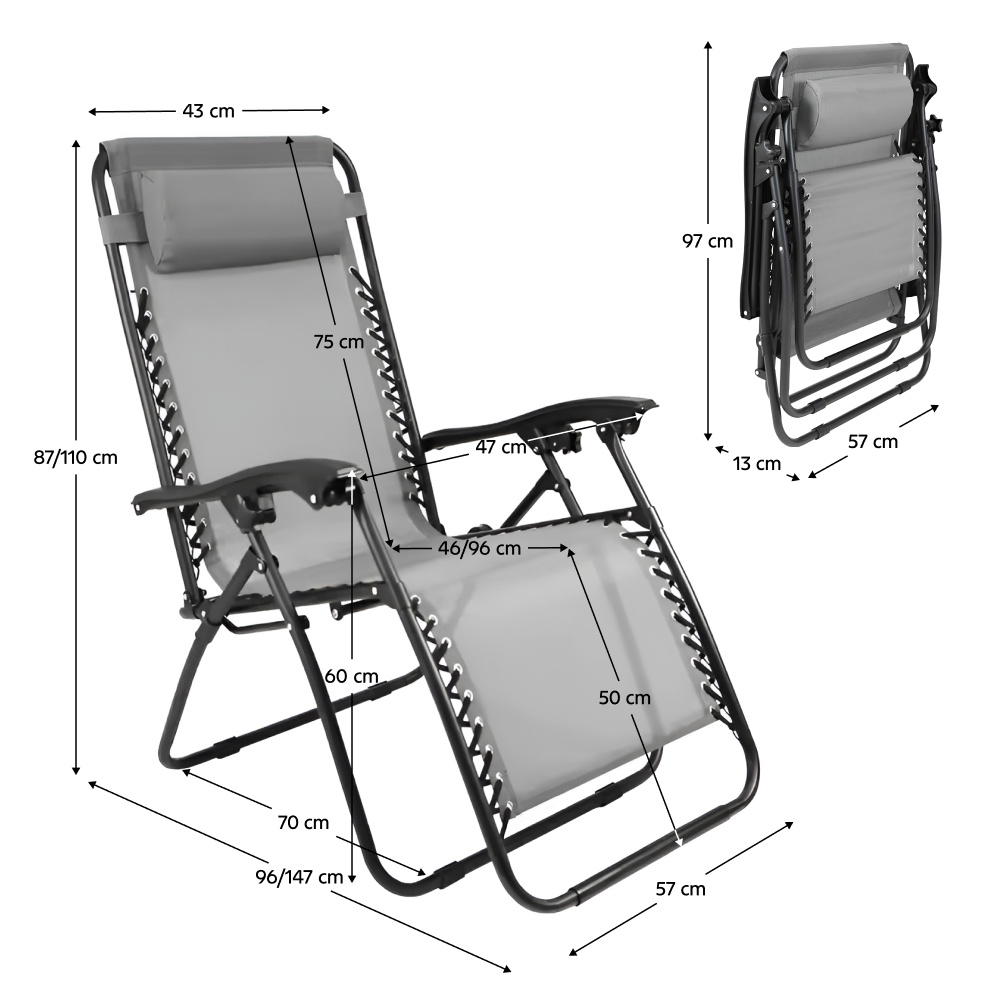 Materiál: umělá textilie/ocel Barva: světle šedá/černá Rozměry (ŠxHxV): 67x91/153x86/109 cm Rozměry po složení (ŠxHxV): 67x13x96 cm Výška sedu: 50 cm Hloubka sedu: 50/96 cm Šířka sedu: 45,5 cm Šířka opěrky zad: 53 cm Výška opěrky zad: 75 cm Výška opěrky na ruku od země: 60 cm Nosnost: 100 kg Hmotnost: 5,75 kg Skládací Polohovací S 5 stupni polohování Měkká opěrka hlavy Praktické Moderní design Dodáváno v monte