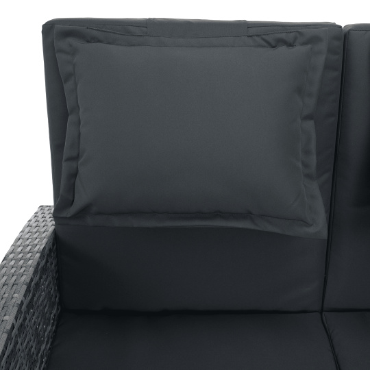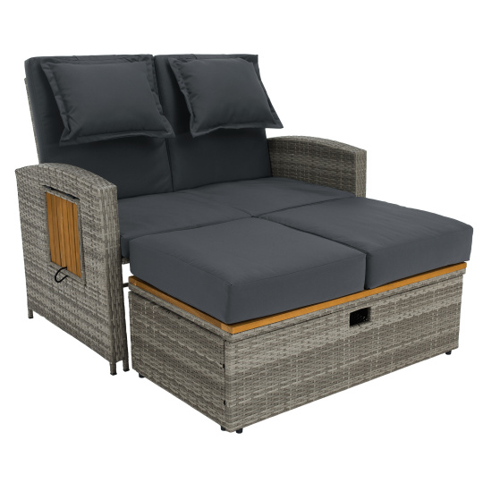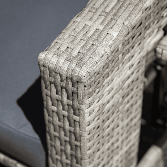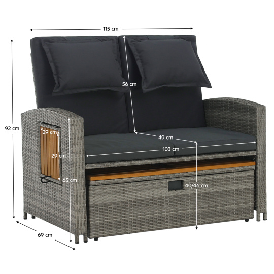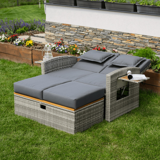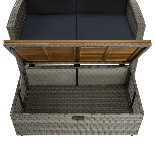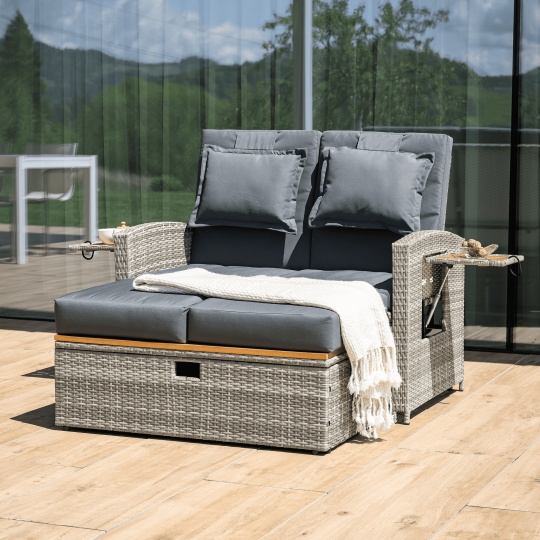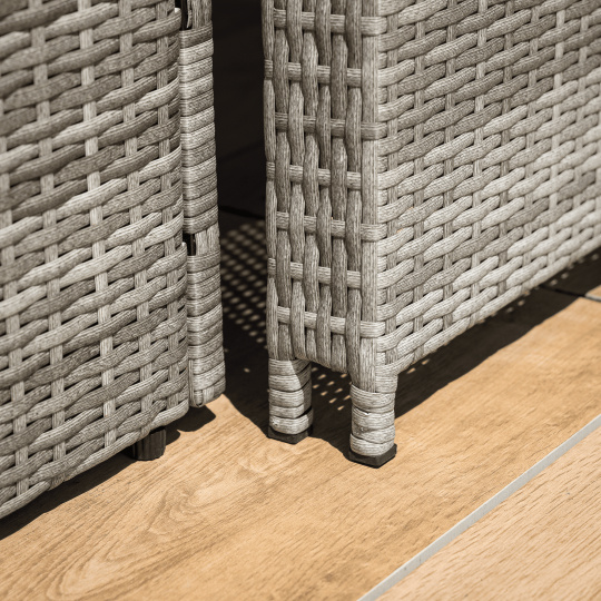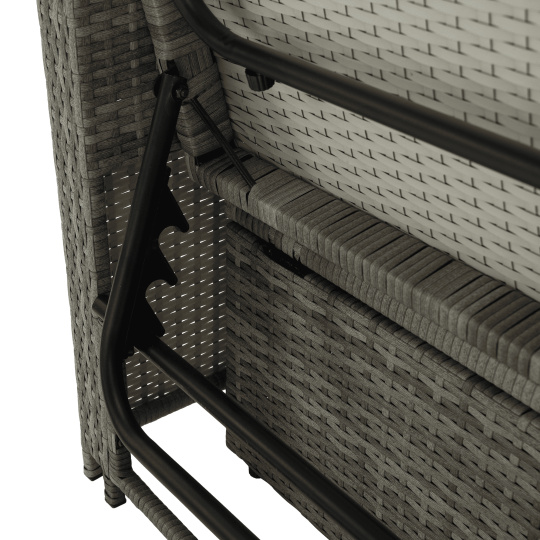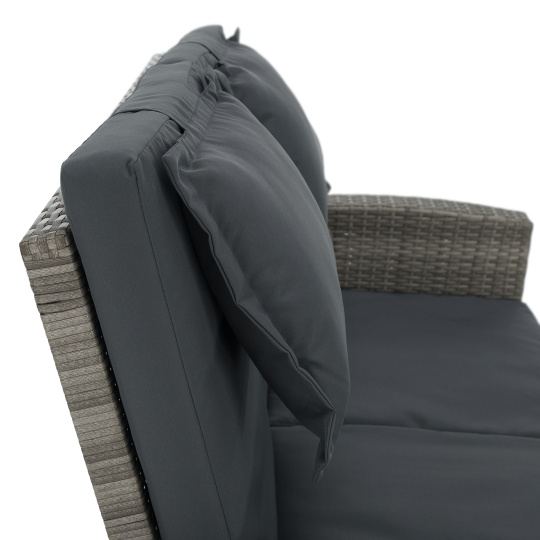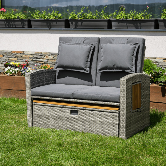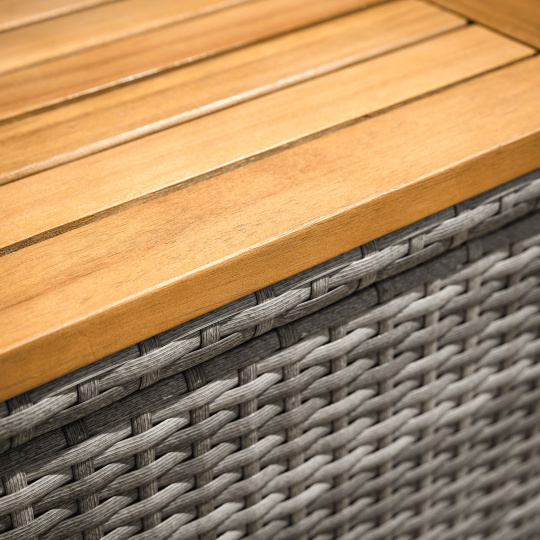 Materiál: technický ratan/ocel/látka/akáciové dřevo Oděruodolnost textilie podle testu Martindale: 95 000 oděrů Barva: šedá/přírodní Rozměry pohovka (ŠxHxV): 115/173x69x92 cm Výška sedu bez polštáře: 40 cm Výška sedu s polštářem: 46 cm Hloubka sedu: 49 cm Šířka sedu: 103 cm Rozměry lavice (ŠxHxV): 99x55,5x33 cm Výška sedu bez polštáře: 33 cm Výška sedu s polštářem: 45 cm Rozměry sklopeného stolku (ŠxH): 29x29 cm Šířka zad: 103 cm Rozměry rozložení (ŠxD): 103x165 cm Výška opěrky na ruku: 65 cm Nosnost: 130 kg Hmotnost: 32 kg 2dílná souprava Pohovka Lavice 2x sklápěcí příruční stolky Polohovací opěrka zad 4 pozice sklápění opěrky zad S područkami Dodáváno s polštáři Snímatelný a voděodolný potah Potahy lze prát při teplotě 30 °C Potahy nesušte v sušičce, nebělte, nečistěte chcemicky a nežehlete Otevírání víka lavice pomocí hydraulického pístu Vhodná pro zahradní nářadí, hračky, polštáře, deky, sezení Lavici lze zasunout pod pohovku Všestranné využití Moderní design Přírodní design Vhodný do exteriéru Odolný vůči povětrnostním podmínkám Doporučujeme výrobek chránit před nepříznivými povětrnostními podmínkami, aby se prodloužila životnost výrobku Dodáváno v demontu