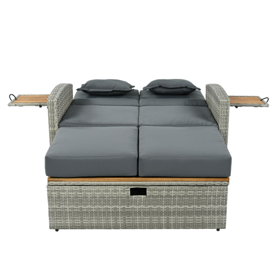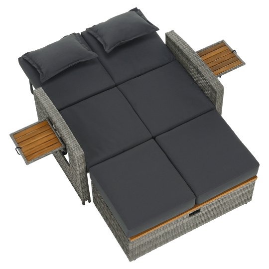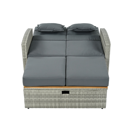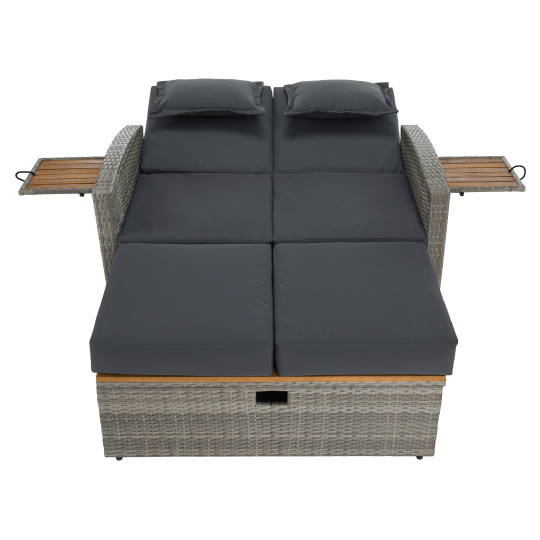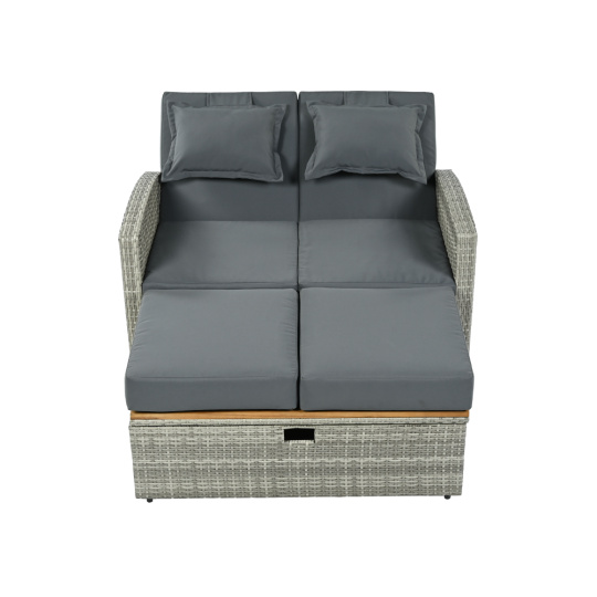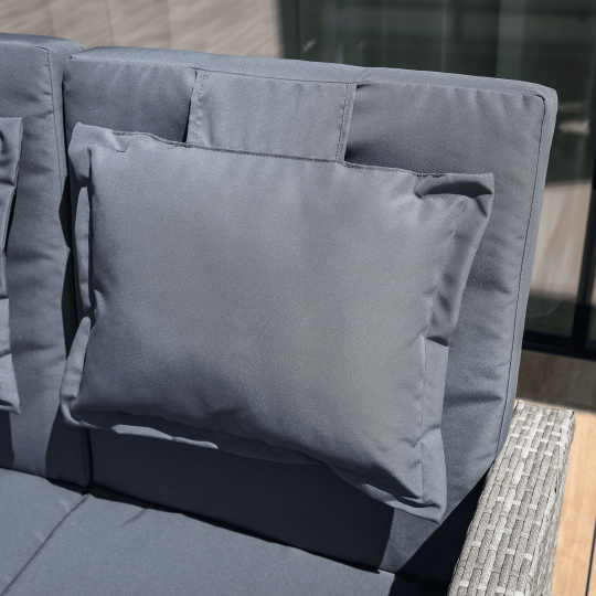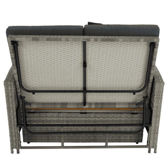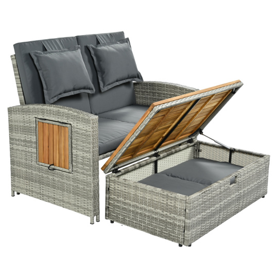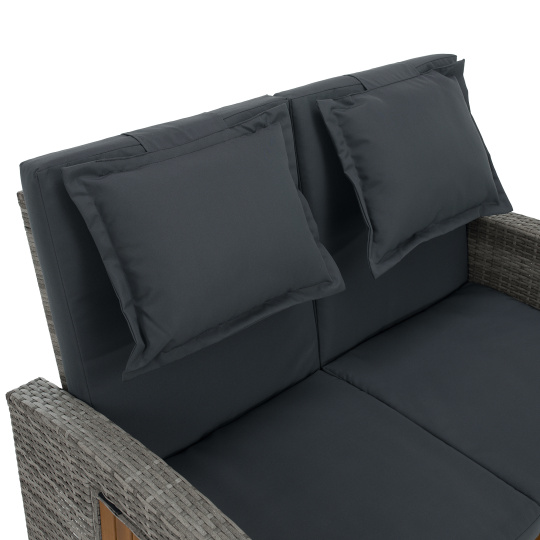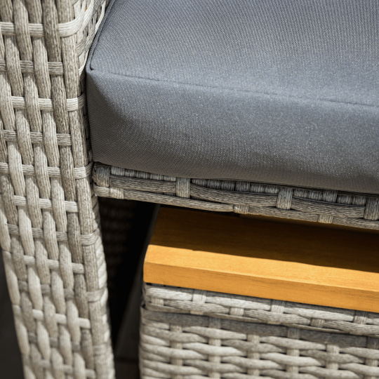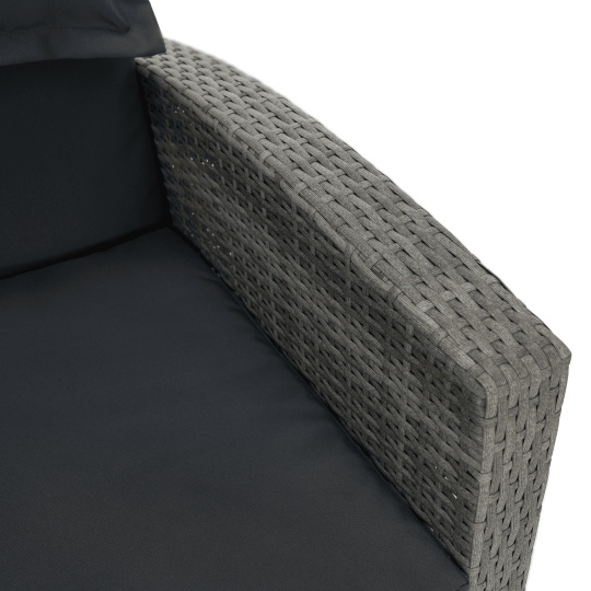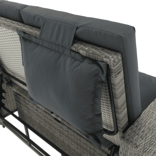 Materiál: technický ratan/ocel/látka/akáciové dřevo Oděruodolnost textilie podle testu Martindale: 95 000 oděrů Barva: šedá/přírodní Rozměry pohovka (ŠxHxV): 115/173x69x92 cm Výška sedu bez polštáře: 40 cm Výška sedu s polštářem: 46 cm Hloubka sedu: 49 cm Šířka sedu: 103 cm Rozměry lavice (ŠxHxV): 99x55,5x33 cm Výška sedu bez polštáře: 33 cm Výška sedu s polštářem: 45 cm Rozměry sklopeného stolku (ŠxH): 29x29 cm Šířka zad: 103 cm Rozměry rozložení (ŠxD): 103x165 cm Výška opěrky na ruku: 65 cm Nosnost: 130 kg Hmotnost: 32 kg 2dílná souprava Pohovka Lavice 2x sklápěcí příruční stolky Polohovací opěrka zad 4 pozice sklápění opěrky zad S područkami Dodáváno s polštáři Snímatelný a voděodolný potah Potahy lze prát při teplotě 30 °C Potahy nesušte v sušičce, nebělte, nečistěte chcemicky a nežehlete Otevírání víka lavice pomocí hydraulického pístu Vhodná pro zahradní nářadí, hračky, polštáře, deky, sezení Lavici lze zasunout pod pohovku Všestranné využití Moderní design Přírodní design Vhodný do exteriéru Odolný vůči povětrnostním podmínkám Doporučujeme výrobek chránit před nepříznivými povětrnostními podmínkami, aby se prodloužila životnost výrobku Dodáváno v demontu