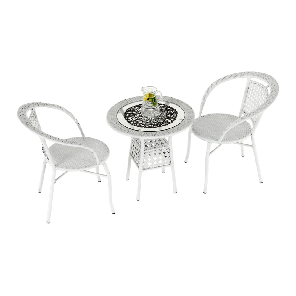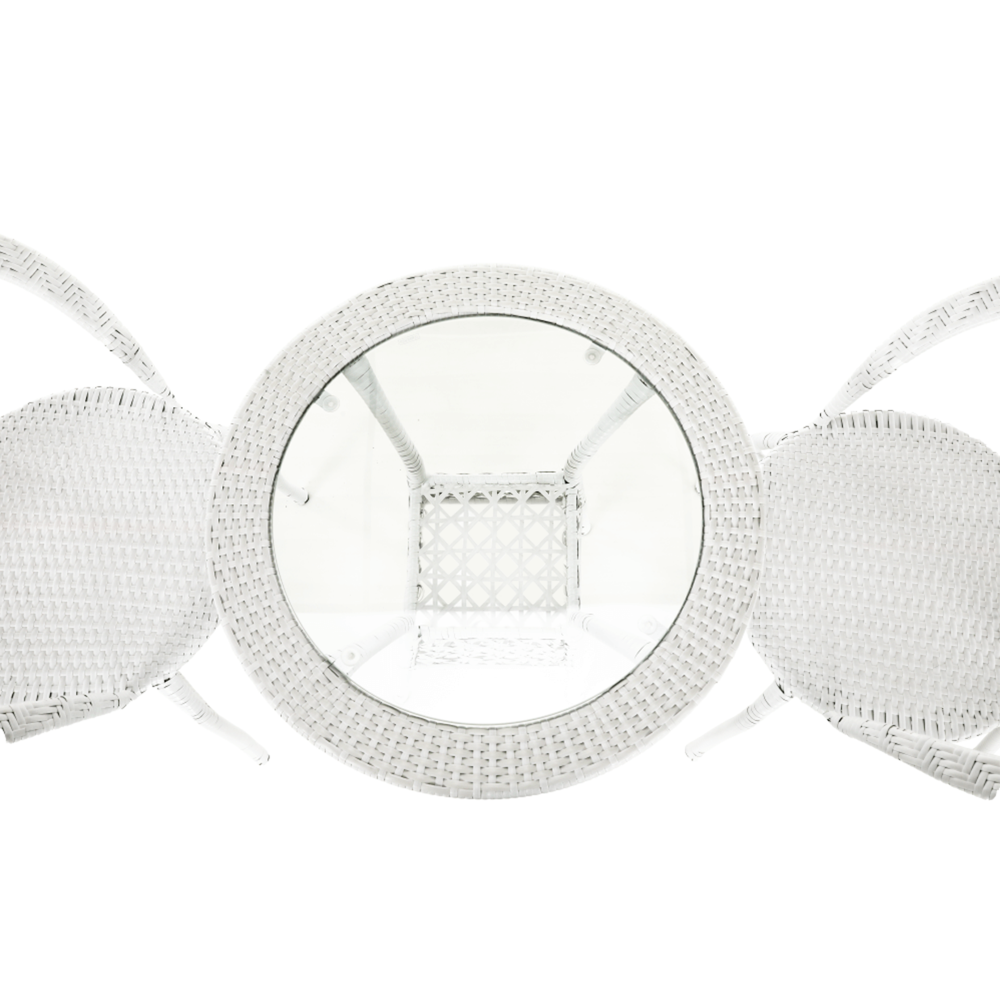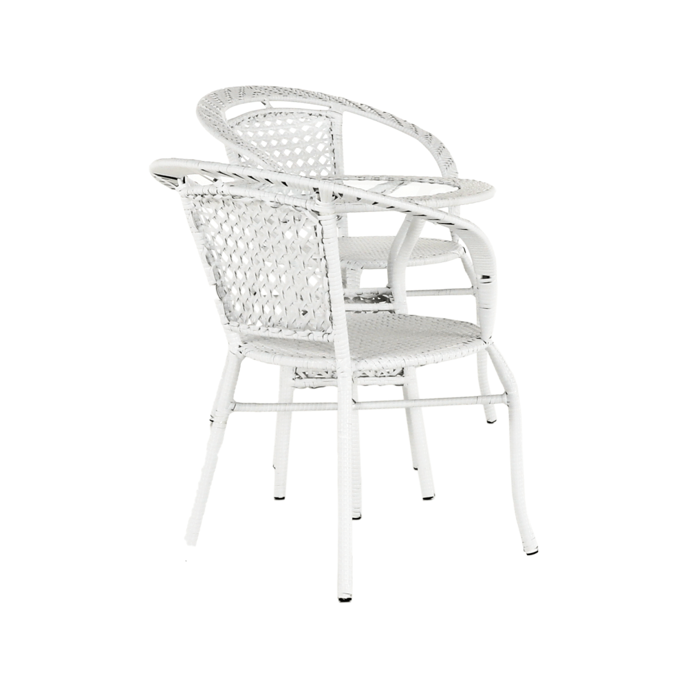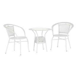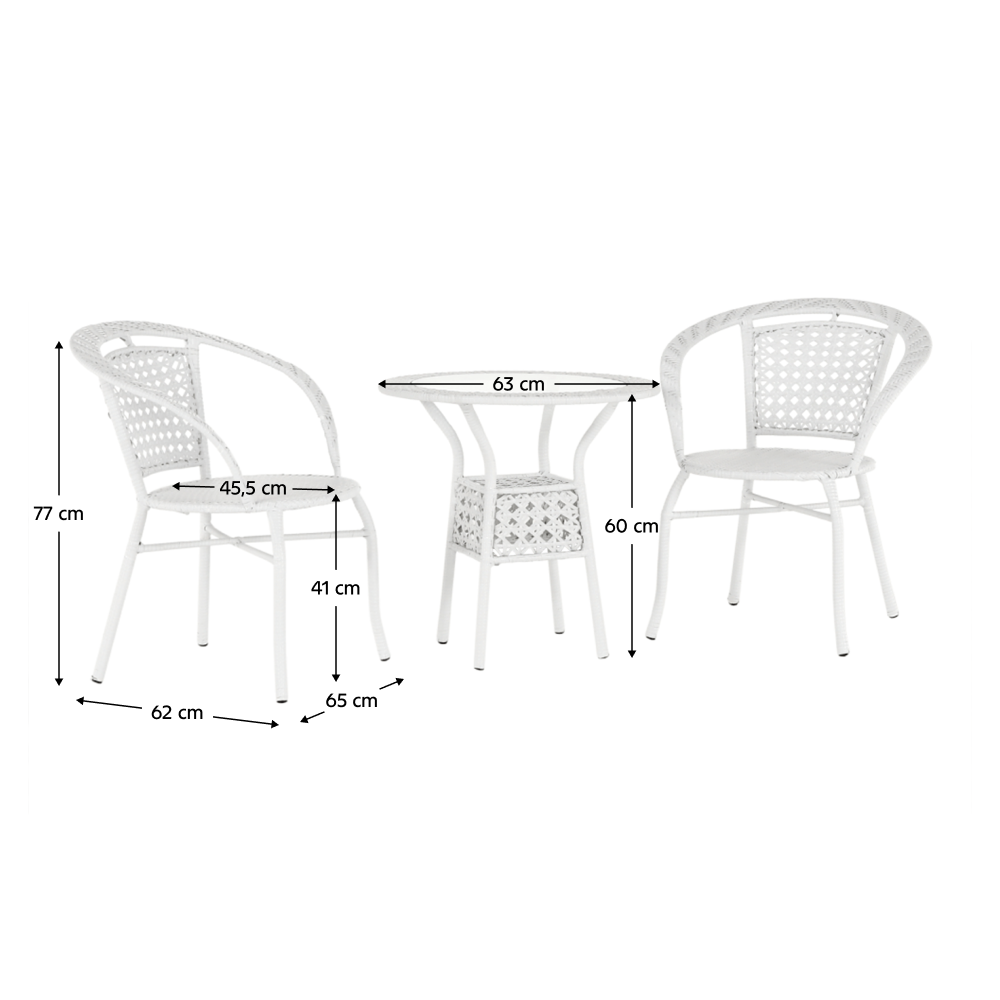Materiál: umělý ratan / ocel / tvrzené sklo Barva: bílá Stůl (průměr x V): 63x60 cm Křeslo (ŠxHxV): 65x62x77 cm Hloubka sedu křesla: 45,5 cm Výška sedu křesla: 41 cm Nosnost křesla: 100 kg 3-dílná souprava Jeden kulatý stůl Dvě křesla Židle / křesla jsou stohovatelné Dodávané v monte