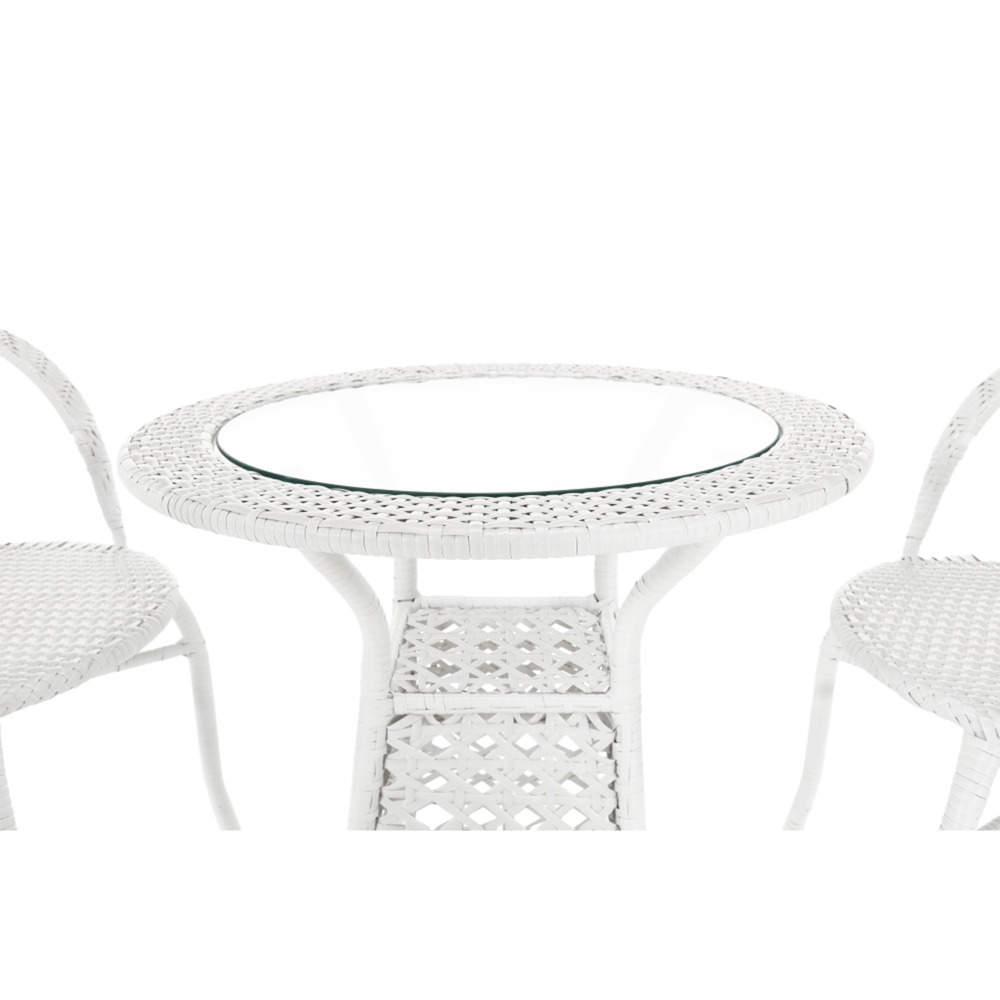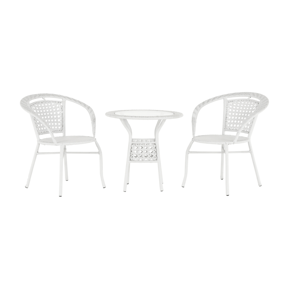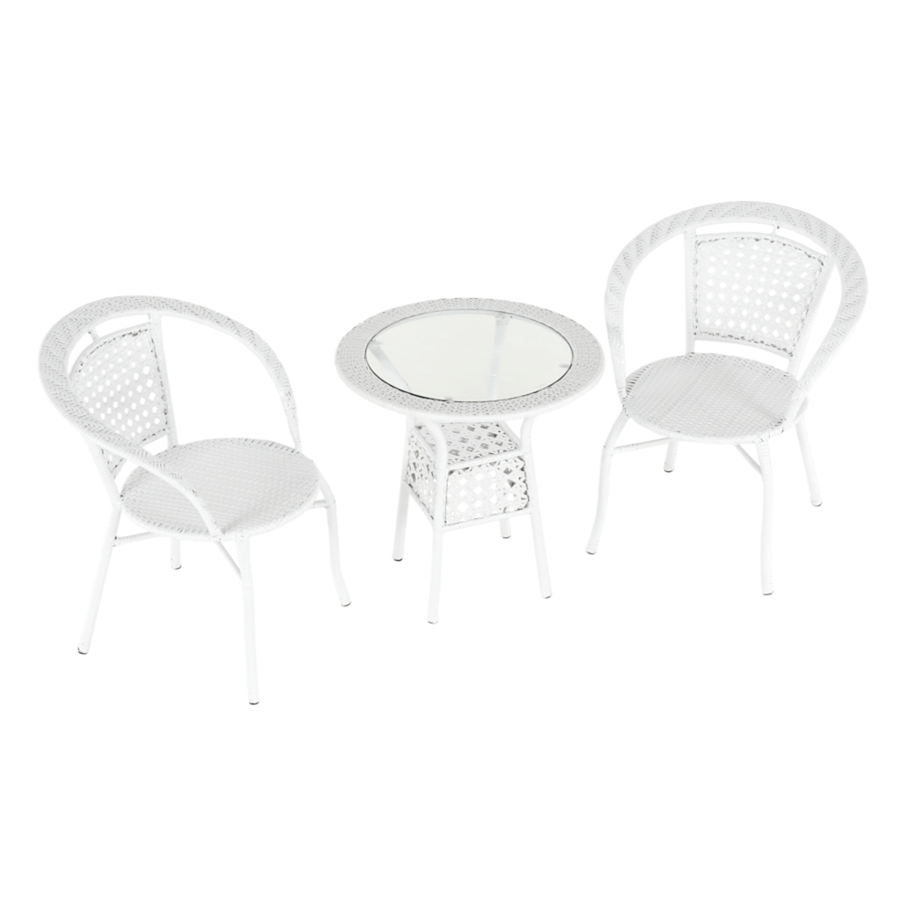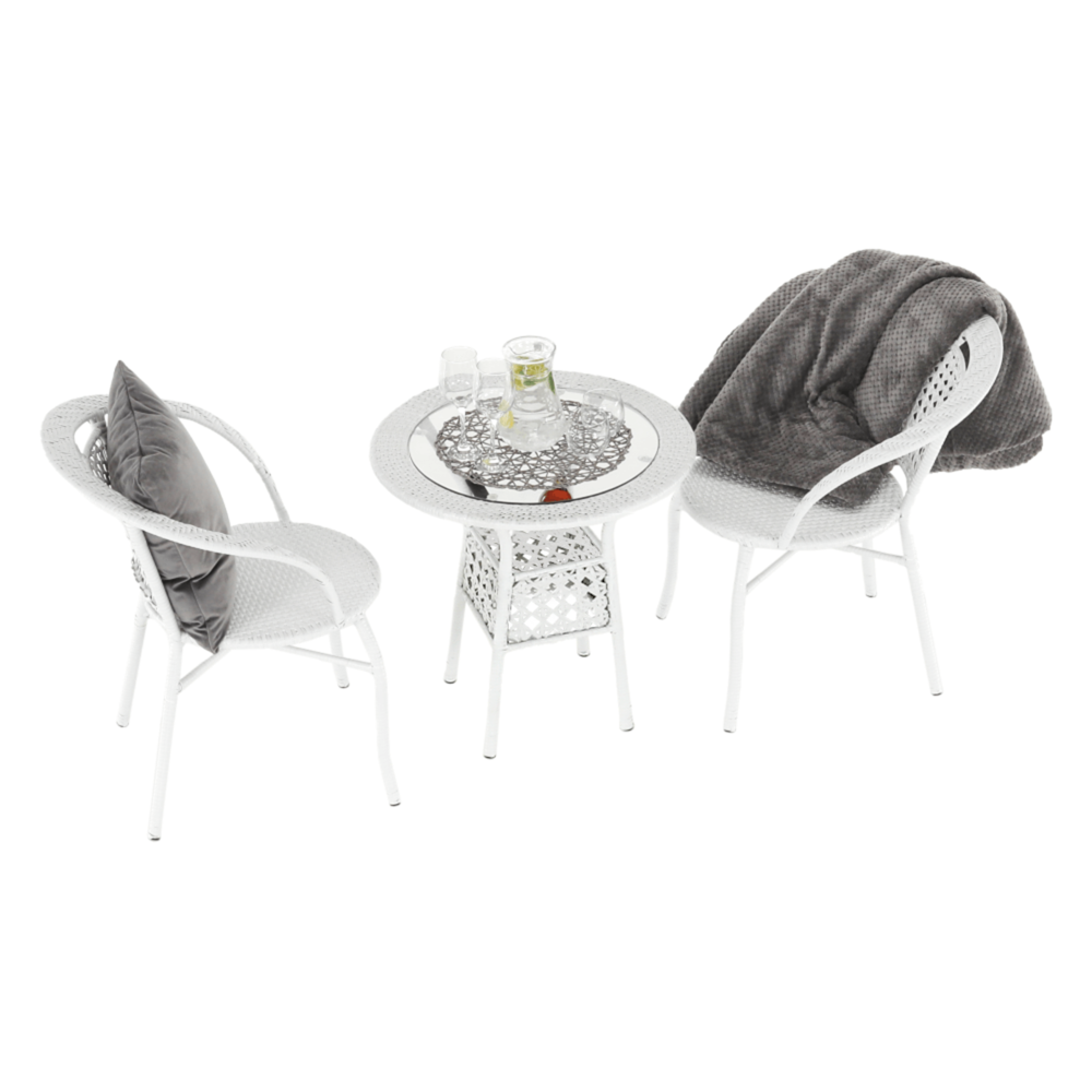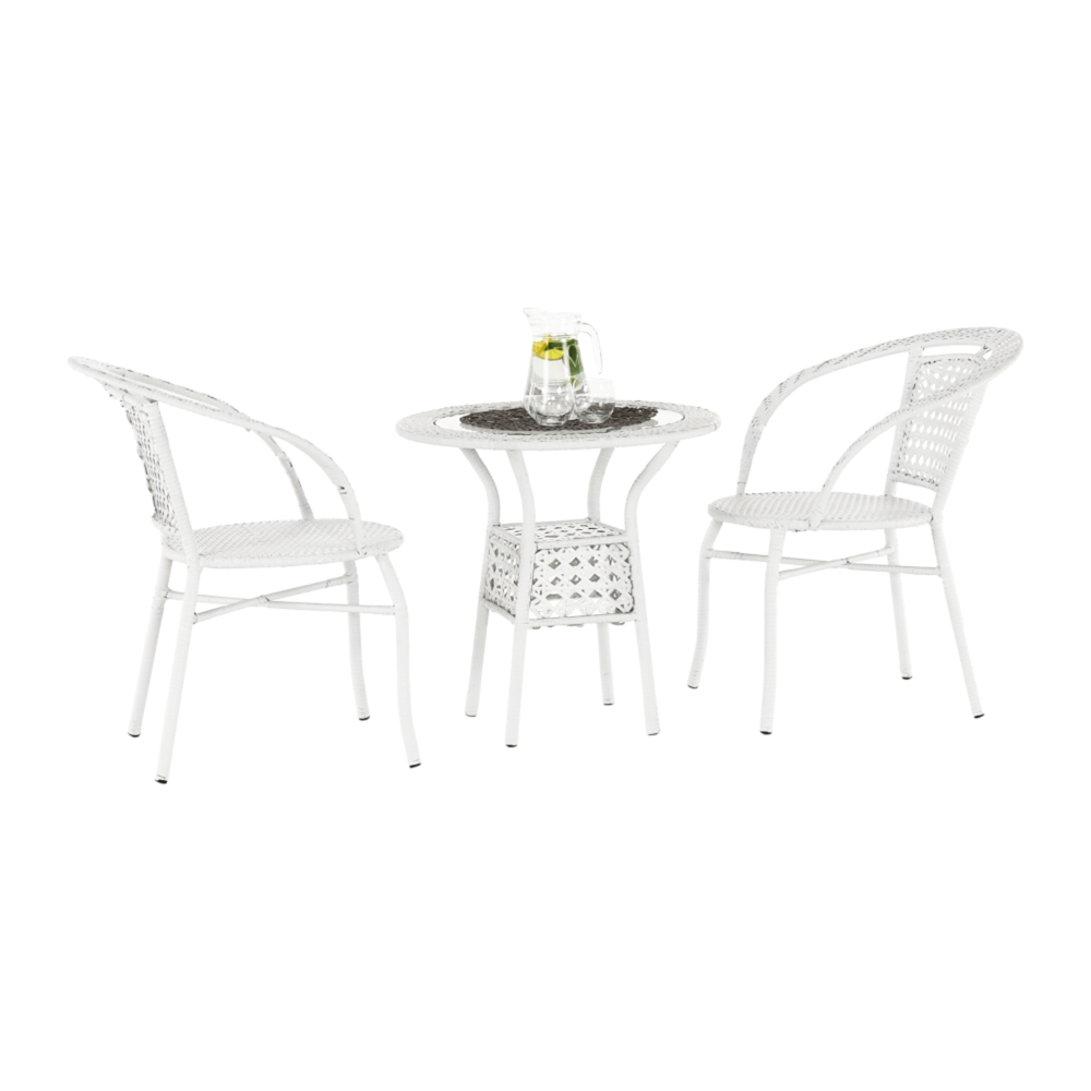 Materiál: umělý ratan / ocel / tvrzené sklo Barva: bílá Stůl (průměr x V): 63x60 cm Křeslo (ŠxHxV): 65x62x77 cm Hloubka sedu křesla: 45,5 cm Výška sedu křesla: 41 cm Nosnost křesla: 100 kg 3-dílná souprava Jeden kulatý stůl Dvě křesla Židle / křesla jsou stohovatelné Dodávané v monte