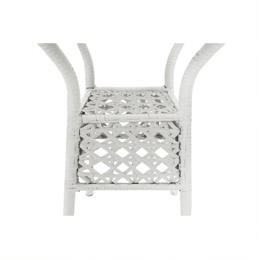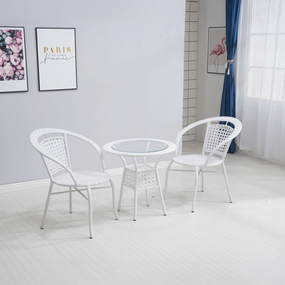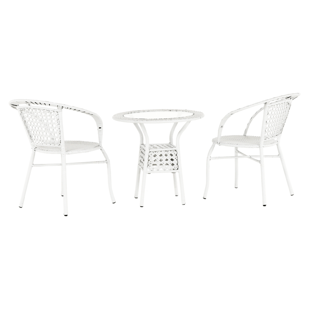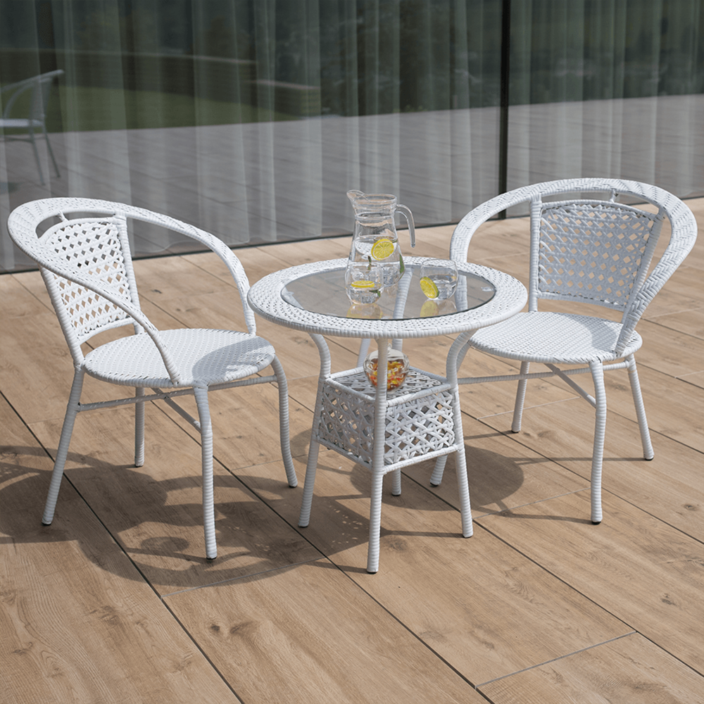 Materiál: umělý ratan / ocel / tvrzené sklo Barva: bílá Stůl (průměr x V): 63x60 cm Křeslo (ŠxHxV): 65x62x77 cm Hloubka sedu křesla: 45,5 cm Výška sedu křesla: 41 cm Nosnost křesla: 100 kg 3-dílná souprava Jeden kulatý stůl Dvě křesla Židle / křesla jsou stohovatelné Dodávané v monte