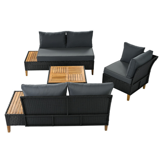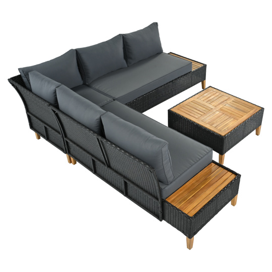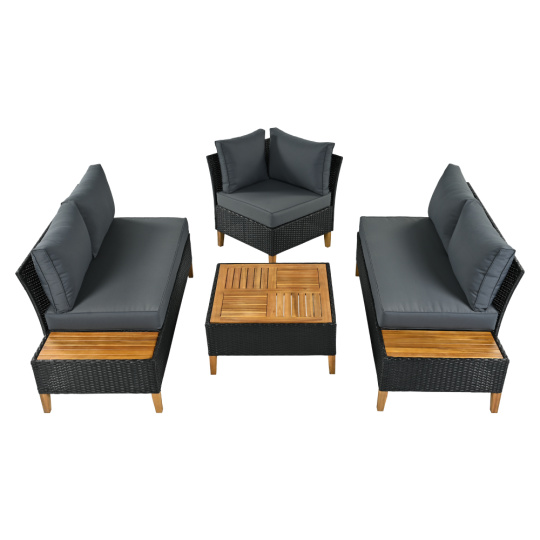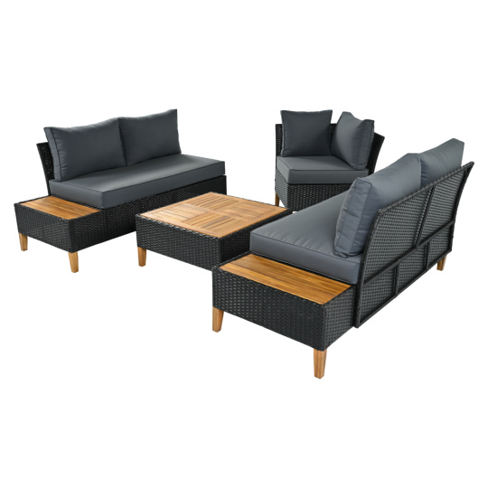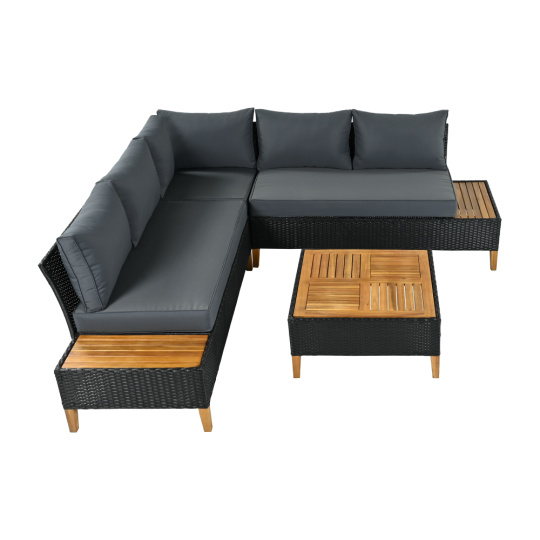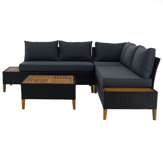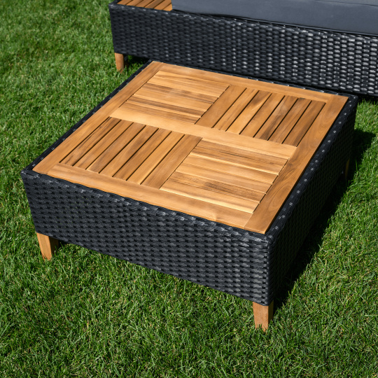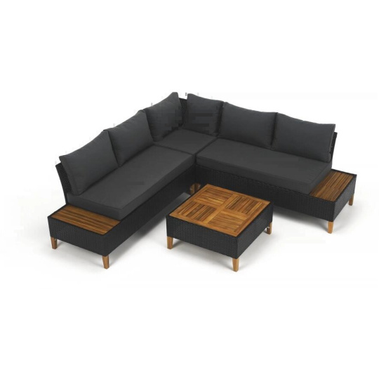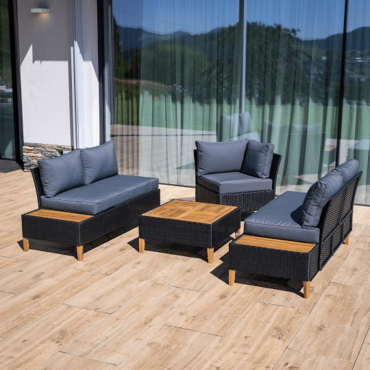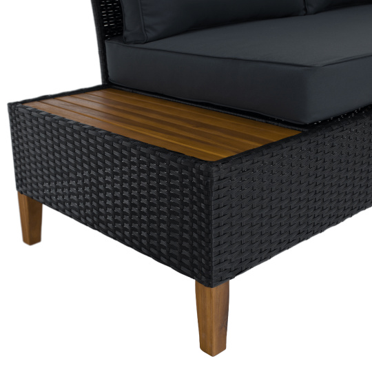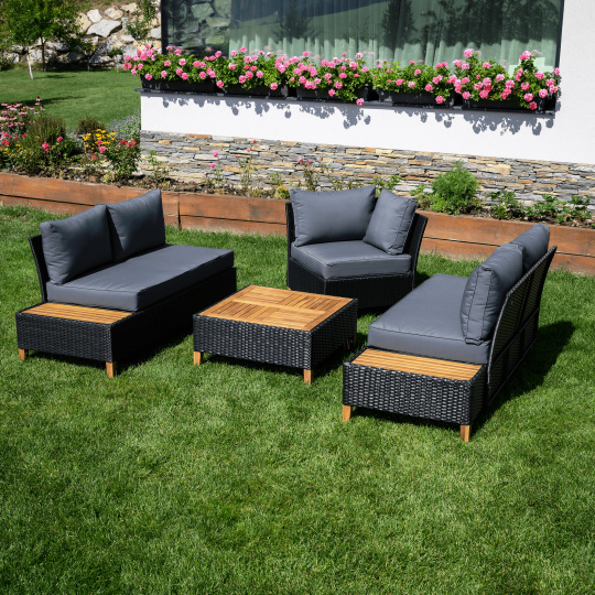 Zahradní ratanový set, akáciové dřevo, černá/šedá/přírodní, MALKOM