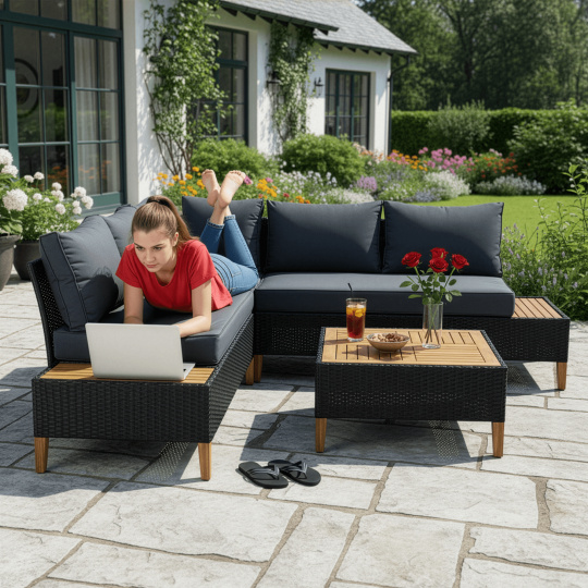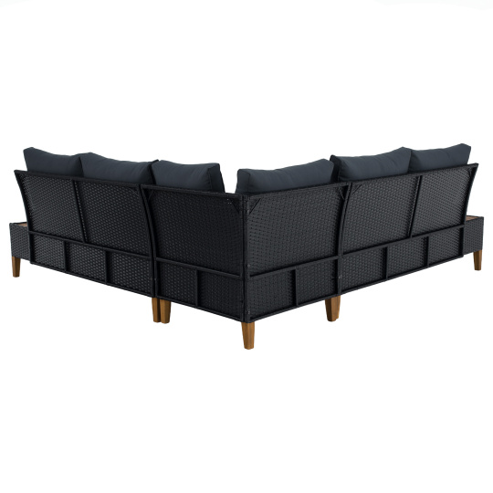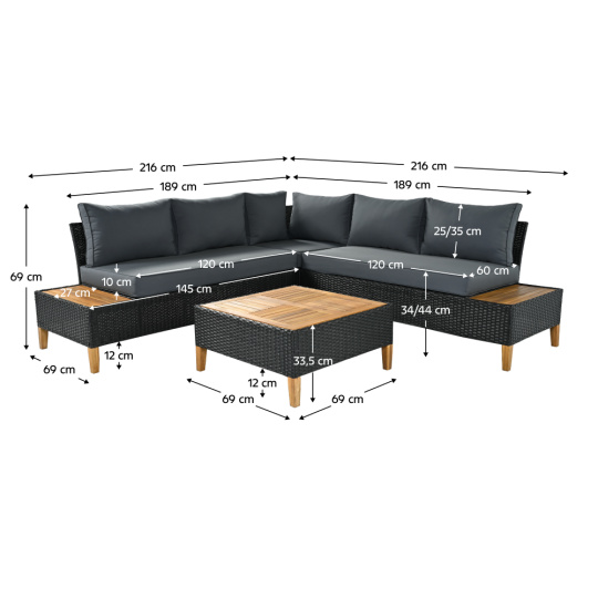 Materiál: technický ratan/ocel/látka/masivní akáciové dřevo Oděruodolnost textilie podle testu Martindale: 95 000 oděrů Barva: černá/šedá/přírodní Rozměry (ŠxHxV): 216/216x69x69 cm Rozměry pohovka (ŠxHxV): 145x69x69 cm Šířka sedu: 120 cm Šířka odkládacího prostoru: 27 cm Rozměry roh (ŠxHxV): 69x69x69 cm Výška sedu s polštářem: 44 cm Výška sedu bez polštáře: 34 cm Rozměry stolek (ŠxHxV): 69x69x35,5 cm Hloubka sezení: 60 cm Výška nožiček: 12 cm Nosnost na osobu: 90 kg 4-dílná souprava 2x pohovka s odkládacím prostorem Roh Konferenční stolek Stolová deska je z masivního akáciového dřeva Dodáváno s polštáři Tloušťka polštáře: 10 cm Snímatelný voděodolný potah Potahy lze prát při teplotě 30°C Díly si můžete přizpůsobit podle potřeb a prostoru Dodáváno v demontu