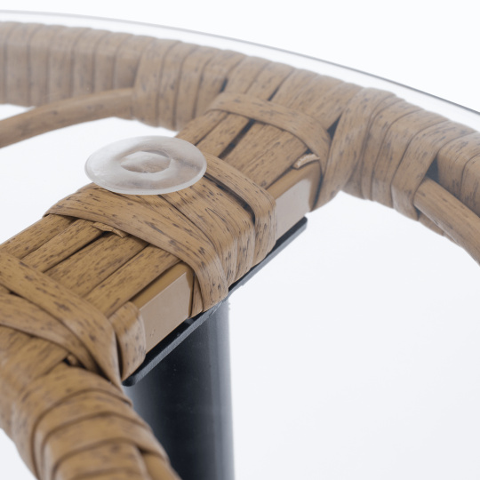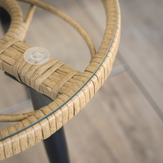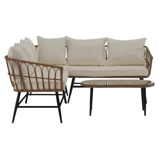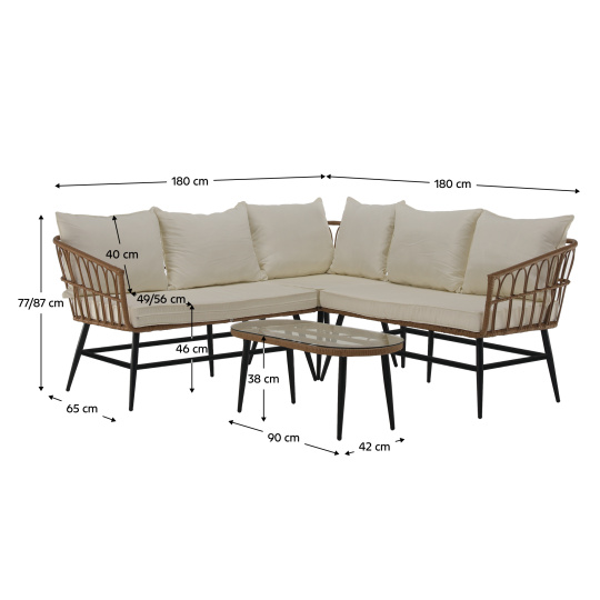 Materiál: technoratan/látka/kov Barva: přírodní/béžová/černá Oděruodolnost textilie podle testu Martindale: 95 000 oděrů Roh (ŠxHxV): 180/180x65x77/78 cm Stůl (ŠxHxV): 90x42x38 cm Výška sedu: 46 cm Hloubka sedu: 49/56 cm Výška zádové opěrky: 40 cm Nosnost stolku: 15 kg Nosnost na osobu: 90 kg 2-dílná souprava Roh Stolek S tvrzeným sklem (5 mm) Dodáváno s polštáři Tloušťka polštáře: 8 cm Voděodolný potah na polštáři Dodáváno v demontu ?