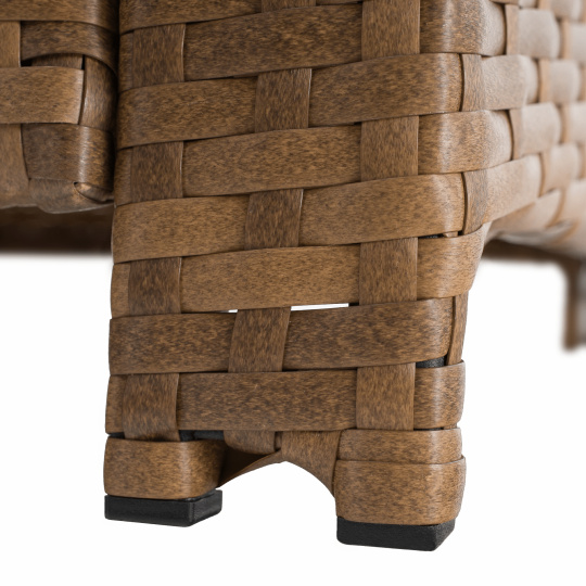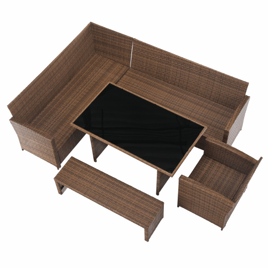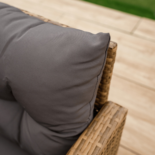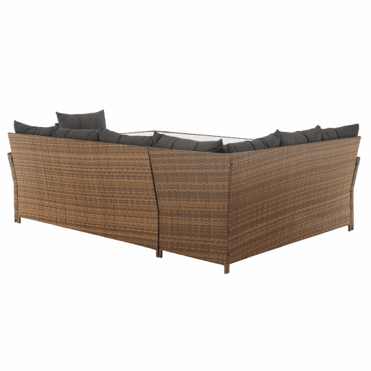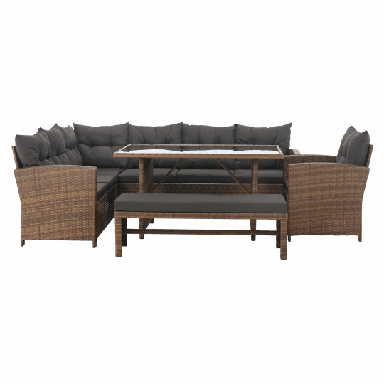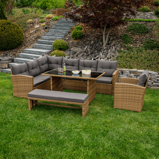 Materiál: technoratan/látka/kov/tvrzené sklo Oděruodolnost textilie podle testu Martindale: 95 000 oděrů Barva: světle hnědá/šedohnědá Rozměry roh (ŠxHxV): 226/173x65x75 cm Rozměry křeslo (ŠxHxV): 65x66x75 cm Rozměry lavice (ŠxHxV): 120x35x39 cm Rozměry stůl (ŠxHxV): 130x75x68 cm Výška sezení: 40 cm Hloubka sezení: 33/54 cm Nosnost na osobu: 90 kg Tloušťka polštáře: 7 cm 4dílná Roh Křeslo Lavice Stůl Jídelní stůl s tvrzeným sklem o tloušťce 5 mm Dodáváno s polštáři Rozměry polštáře (ŠxV): 49x54 cm Voděodolný potah Dodáváno v demontu