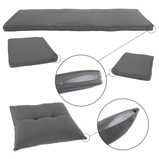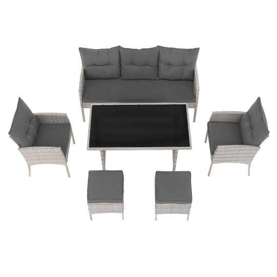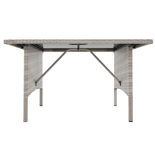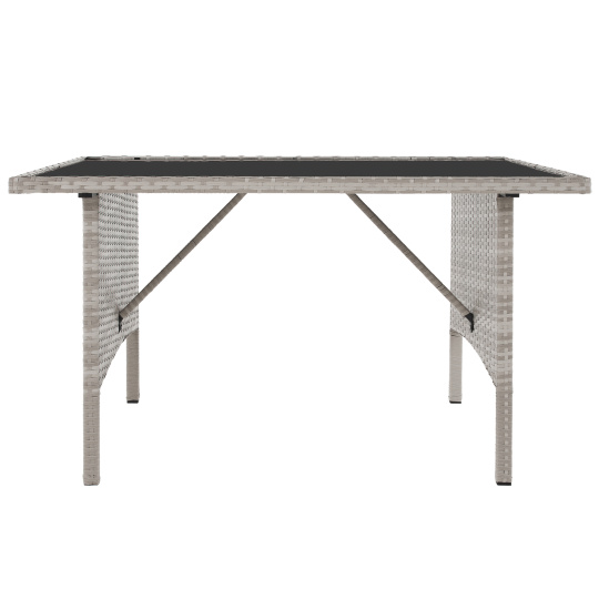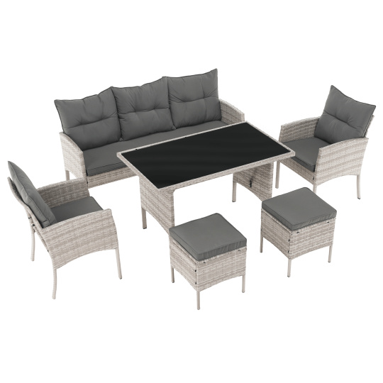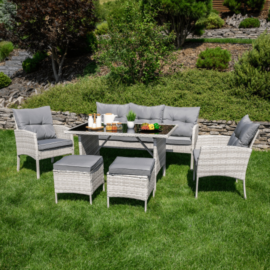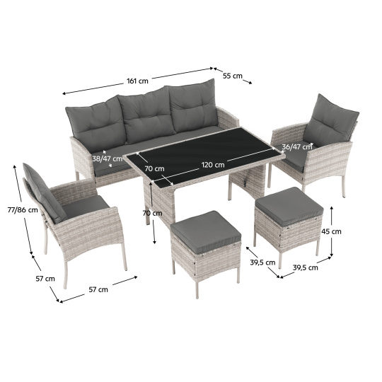 Materiál: technoratan/látka/kov/tvrzené sklo Oděruodolnost textilie podle testu Martindale: 95 000 oděrů Barva: světle šedá Rozměry trojsed (ŠxHxV): 161x55x77/86 cm Hloubka sedu: 38/47 cm Rozměry stůl (ŠxHxV): 120x70x70 cm Rozměry křeslo (ŠxHxV): 57x57x77/86 cm Hloubka sedu křesla: 36/47 cm Rozměry taburet (ŠxHxV): 39,5x39,5x45 cm Výška sedu: 45 cm Výška zádové opěrky: 34 cm Nosnost na osobu :90 kg Nosnost stolu :35 kg Dodáváno s polštáři Tloušťka polštáře: 6 cm 6-dílná souprava Třísed 2x křeslo 2x taburet Jídelní stůl S tvrzeným sklem (5 mm) Potah je voděodolný Dodáváno v demontu