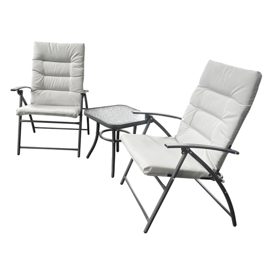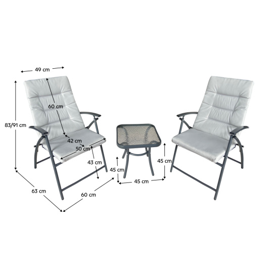 Materiál: látka/kov Barva: světle šedá/tmavě šedá Oděruodolnost textilie podle testu Martindale: 95 000 oděrů Stůl (ŠxHxV): 45x45x45 cm Křeslo (ŠxHxV): 60x63x83/91 cm Výška sedu: 43 cm Hloubka sedu: 42 cm Šířka sedu: 50 cm Výška zad: 60 cm Šířka zad: 49 cm Nosnost křesla: 90 kg Nosnost stolu: 15 kg S polštáři Potahy nejsou snímatelné Voděodolné Tloušťka polštáře: 3 cm 3-dílná souprava 1x stůl 2x židle Křesla dodávaná v monte Stolek dodáván v demontu