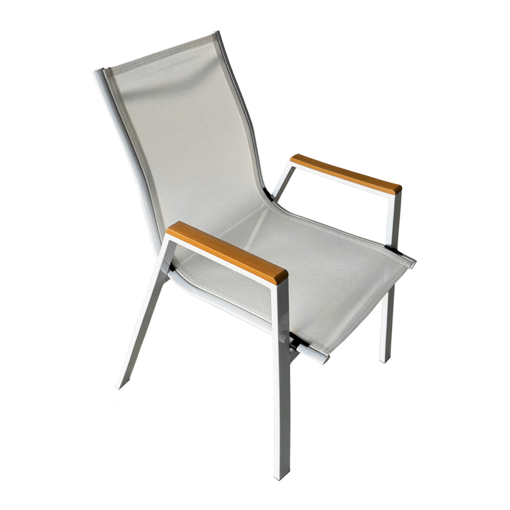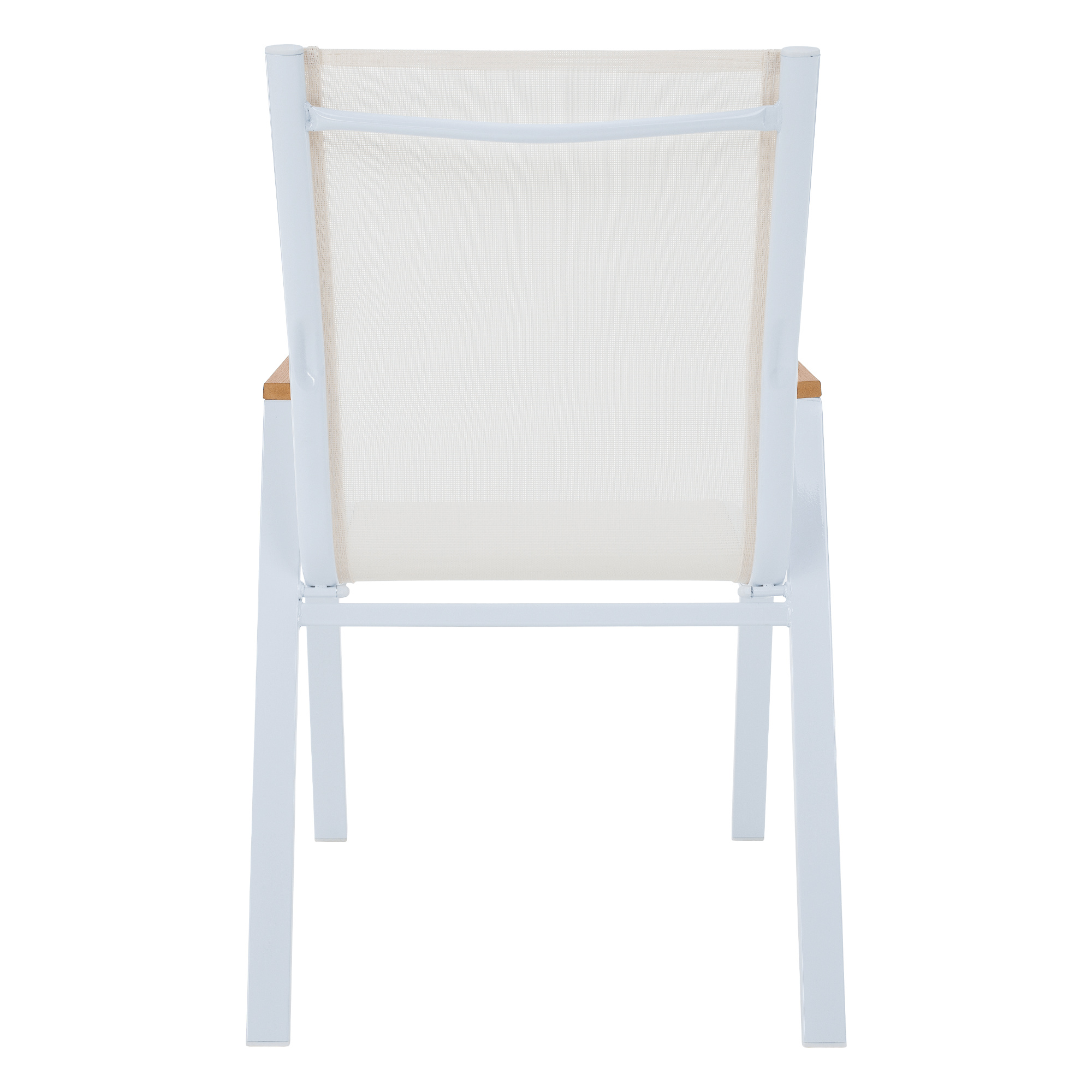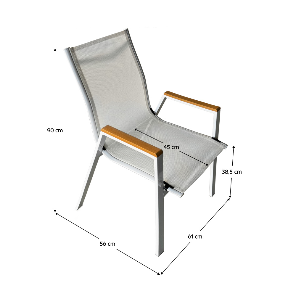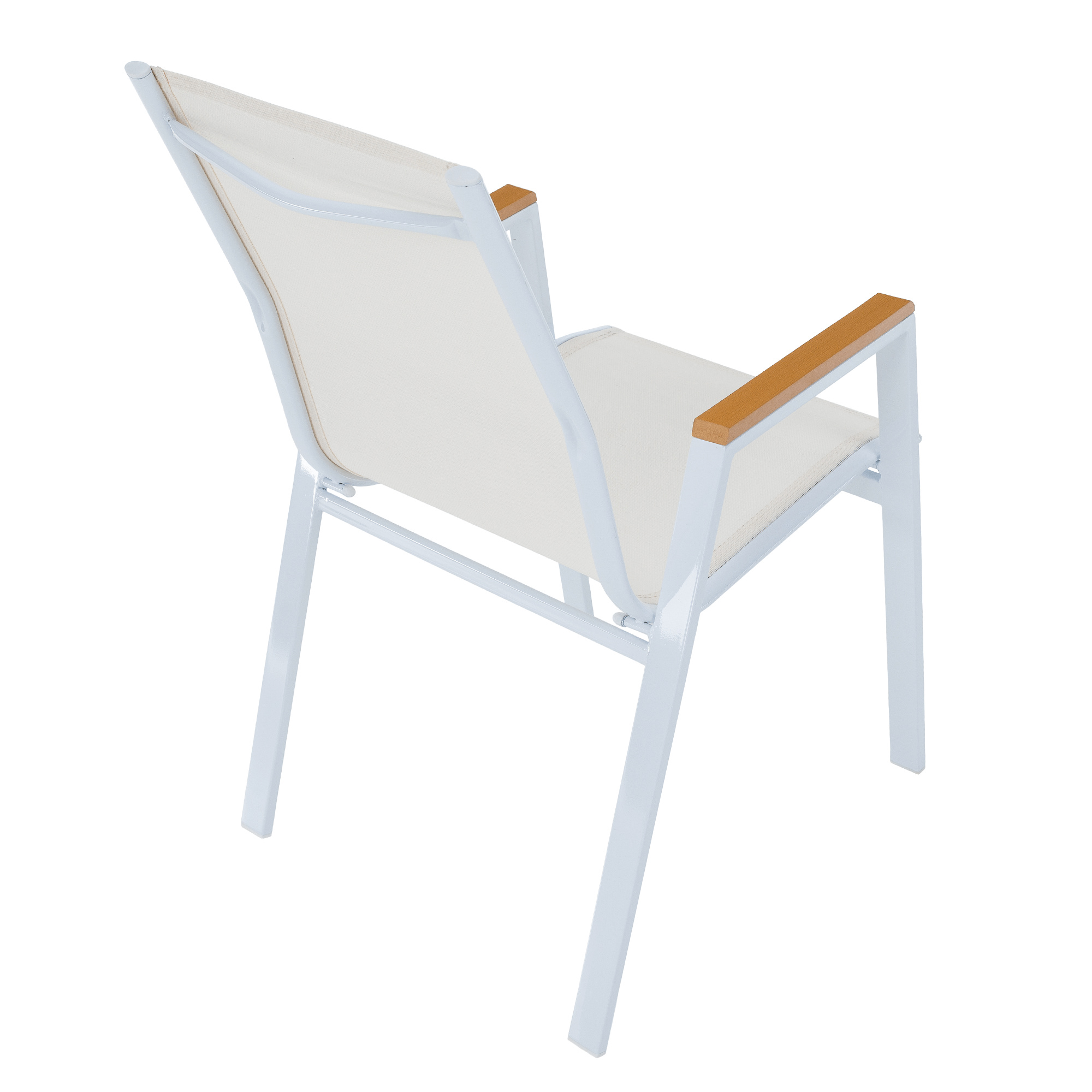 Materiál: ocel/umělá textilie/polywood Barva: bílá/dub Rozměry (ŠxHxV): 61x56x90 cm Výška sedu: 38,5 cm Hloubka sedu: 45 cm Nosnost: 100 kg Zahradní Stohovatelná S područkami Dodáváno v monte