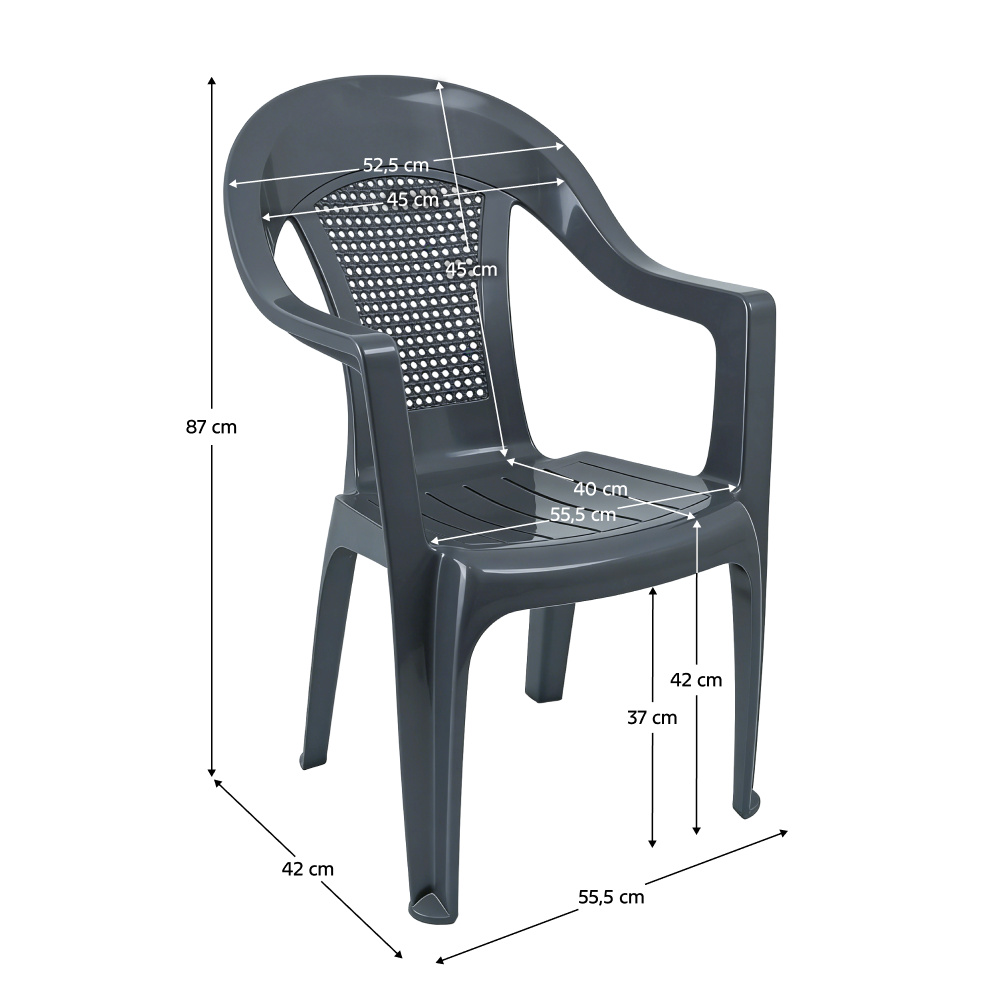 Materiál: plast Barva: antracit Rozměry (ŠxHxV): 55,5x42x87 cm Výška sedu: 42 cm Hloubka sedu: 40 cm Šířka sedu:55,5 cm Šířka zad: 45 cm Výška zad: 45 cm Nosnost: 100 kg Otvory pro odtok vody Stohovatelné Snadné skladování Zahradní Dodáváno v monte