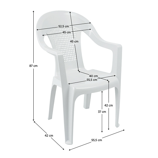 Materiál: plast Barva: bílá Rozměry (ŠxHxV): 55,5x42x87 cm Výška sedu: 42 cm Hloubka sedu: 40 cm Šířka sedu:55,5 cm Šířka zad: 45 cm Výška zad: 45 cm Nosnost: 100 kg Otvory pro odtok vody Stohovatelné Snadné skladování Zahradní Dodáváno v monte