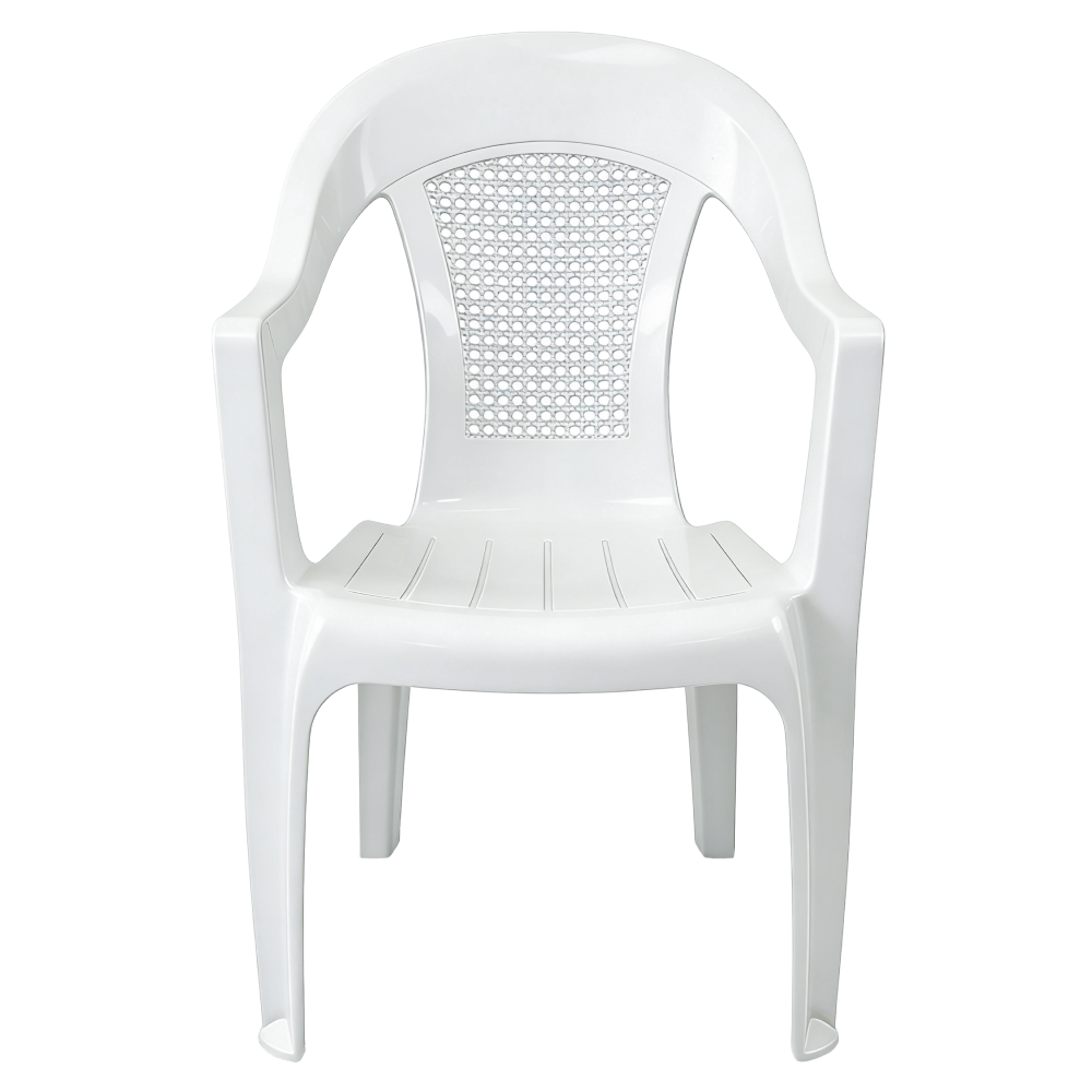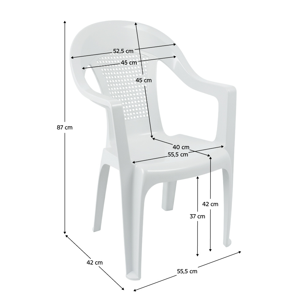 Materiál: plast Barva: bílá Rozměry (ŠxHxV): 55,5x42x87 cm Výška sedu: 42 cm Hloubka sedu: 40 cm Šířka sedu:55,5 cm Šířka zad: 45 cm Výška zad: 45 cm Nosnost: 100 kg Otvory pro odtok vody Stohovatelné Snadné skladování Zahradní Dodáváno v monte