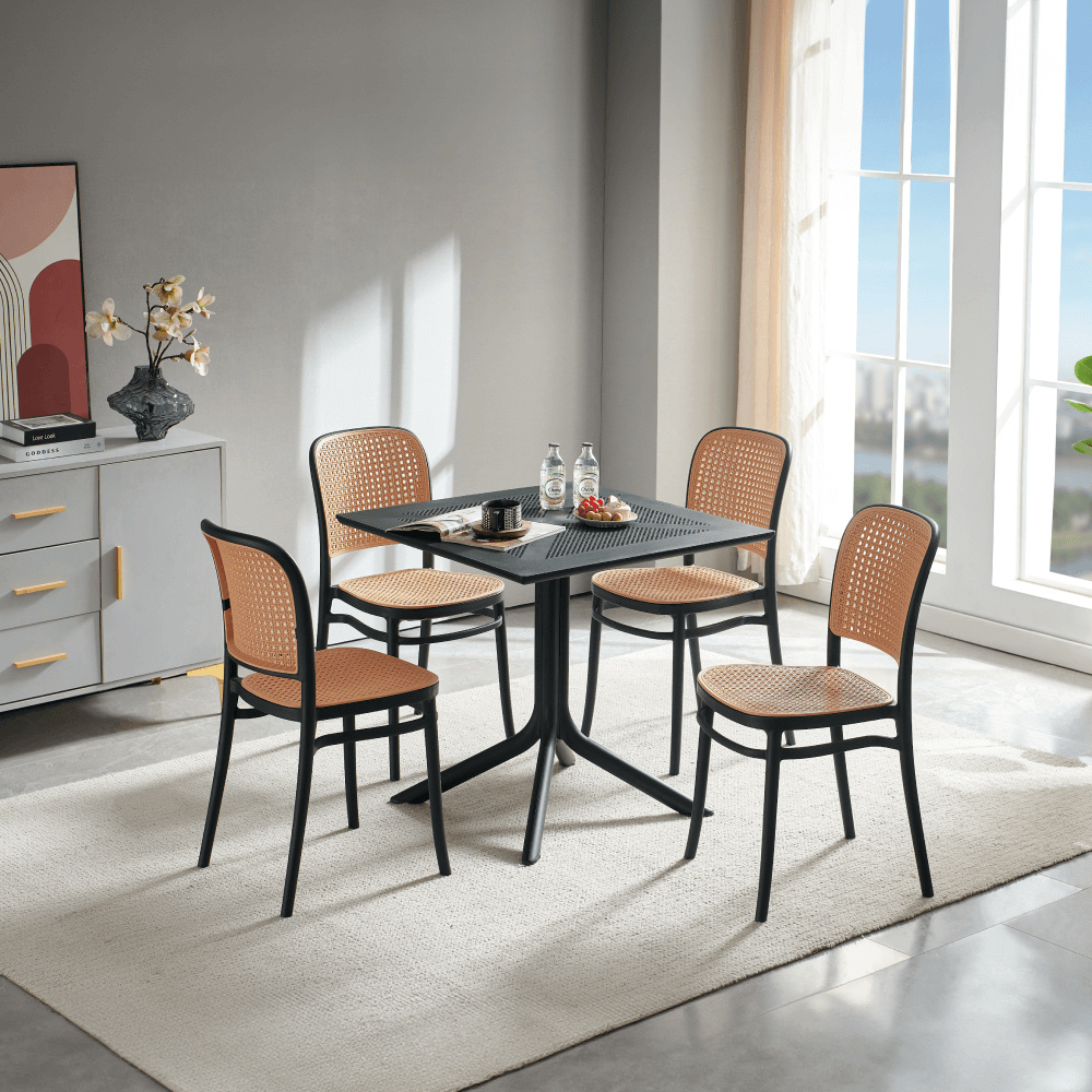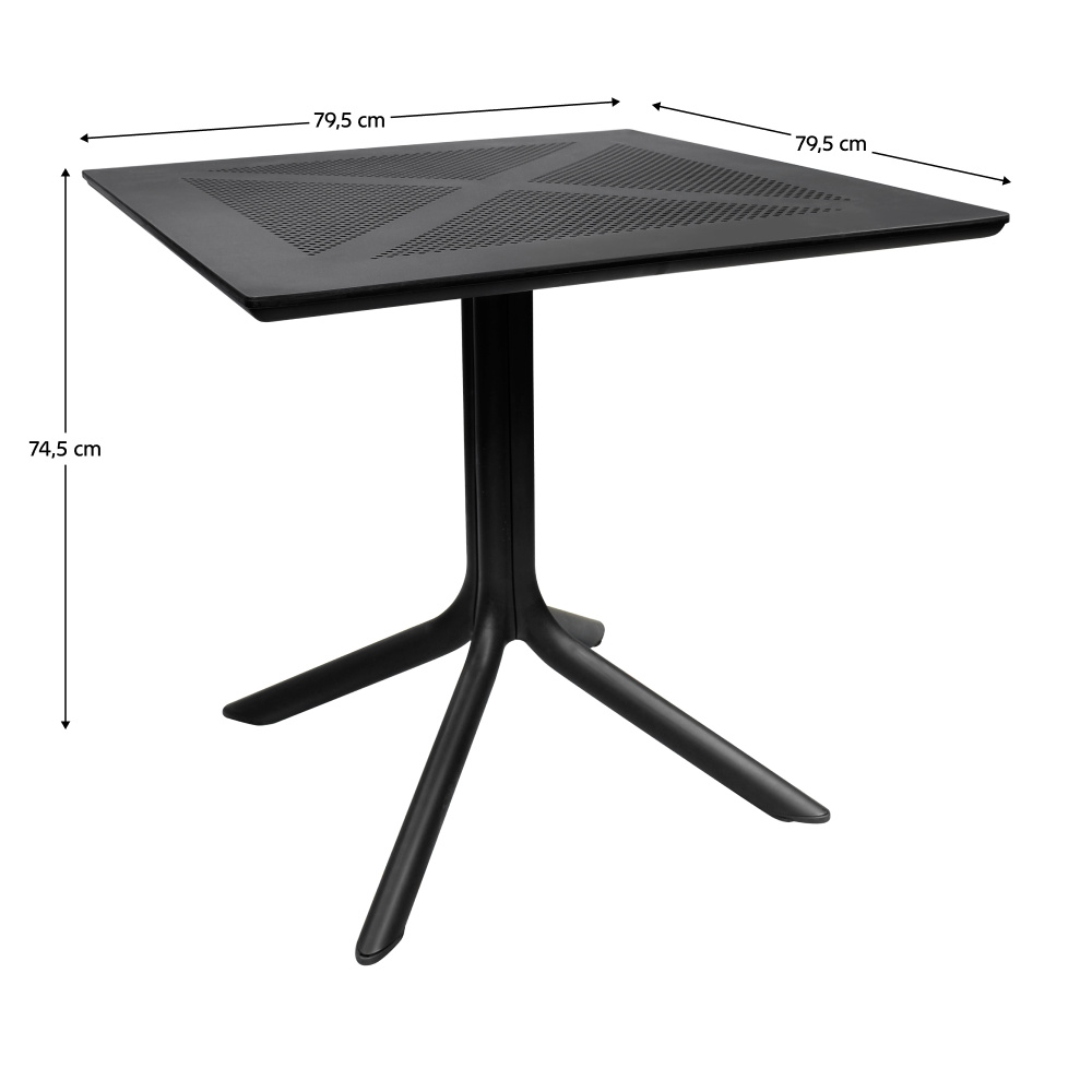 Materiál: plast Barva: černá Rozměry (ŠxHxV): 79,5x79,5x74,5 cm Nosnost: 50 kg Hmotnost: 10,5 kg Jednoduchý Praktický Na nožičkách Jídelní/zahradní stůl Vhodný do interiéru i exteriéru Stolování pro 4 lidi Dodáváno v demontu