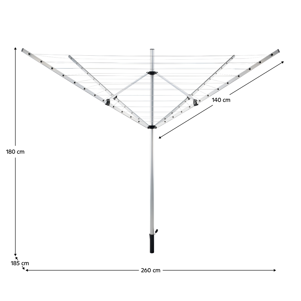 Materiál: hliník Barva: stříbrná Rozměry otevřeného sušáku (ŠxHxV): 260x185x180 cm Rozměry zavřeného sušáku (ŠxHxV): 13,5x13,5x181 cm Průměr nosné tyče: 3,8 cm Nosnost: 20 kg Uzemňovací plastová zásuvka Rotační 4 ramena Materiál lana na sušení: PVC Délka tkaničky na prádlo: 50 m Venkovní použití Možnost nastavení výšky Antikorozní nátěr Odolný vůči povětrnostním podmínkám Doporučujeme výrobek chránit před nepříznivými povětrnostními podmínkami, aby se prodloužila životnost výrobku