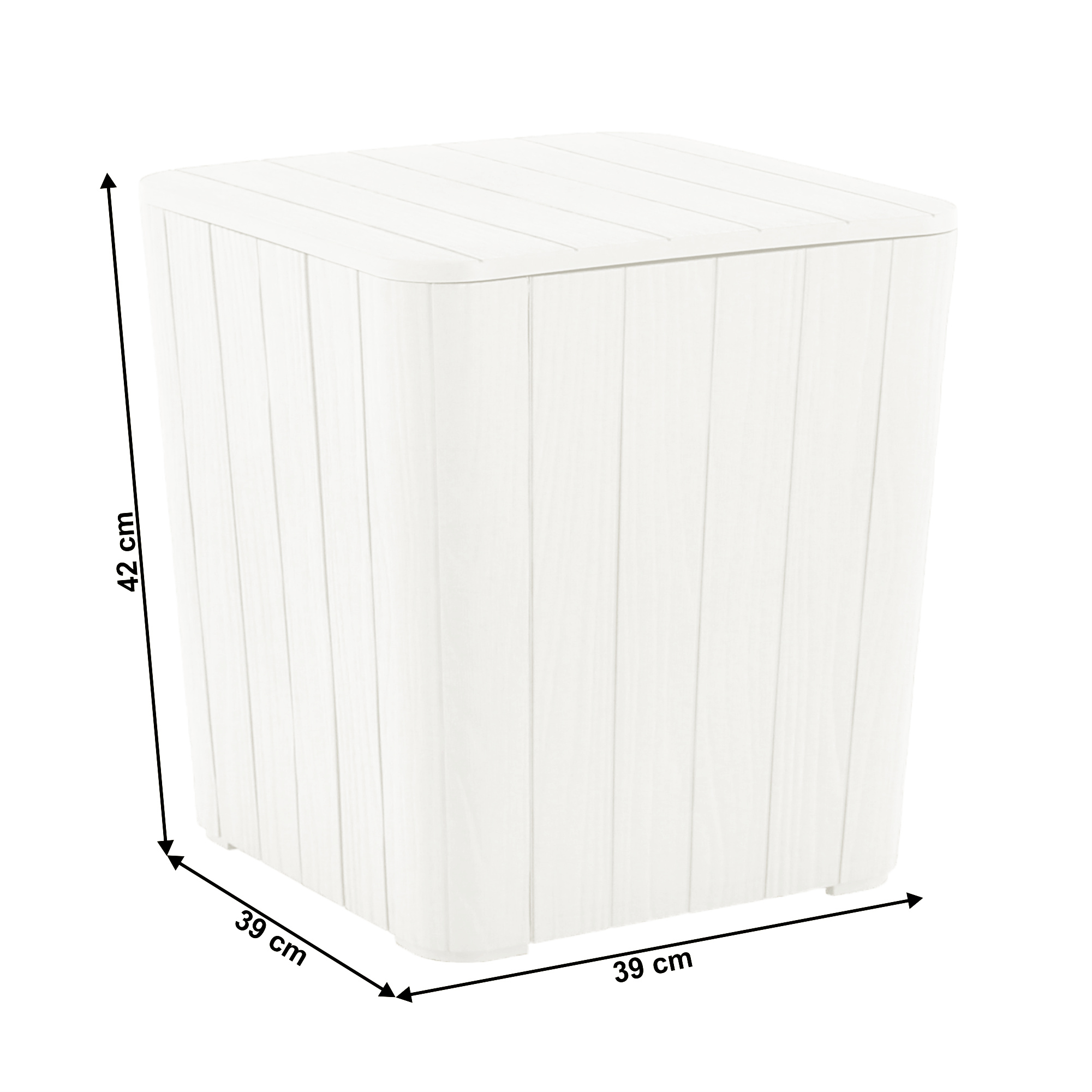 Materiál: plast Barva: bílá Rozměry (ŠxHxV): 39x39x42 cm Objem: 43 litrů úložný box Využití i jako příruční stolek Nevhodný na sezení Dodávané v demontu