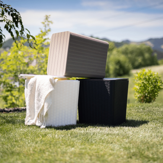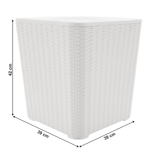 Materiál: plast Barva: bílá Rozměry (ŠxHxV): 39x39x42 cm Objem: 43 litrů úložný box Využití jakož i příruční stolek Nevhodný na sezení Dodávané v demontu