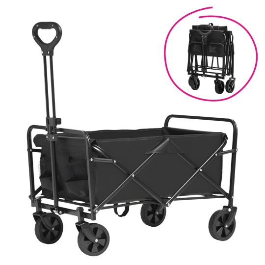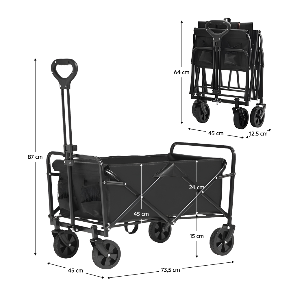 Materiál: ocel/látka Oxford Oděruodolnost látky podle testu Martindale: 7 600 oděrů Barva: černá Rozměry (ŠxHxV): 45x73,5x64/87 cm Rozměry složené vozíku (ŠxHxV): 45x12,5x64 cm Nosnost: 100 kg Hmotnost: 5 kg Objem: 60 l Praktický Skládací Výškově nastavitelná rukojeť 2 pevná a 2 otočná kolečka Průměr kolečka: 12 cm Odnímatelný látkový košík 2 boční kapsy Jednoduchá manipulace a skladování Dodáváno v monte