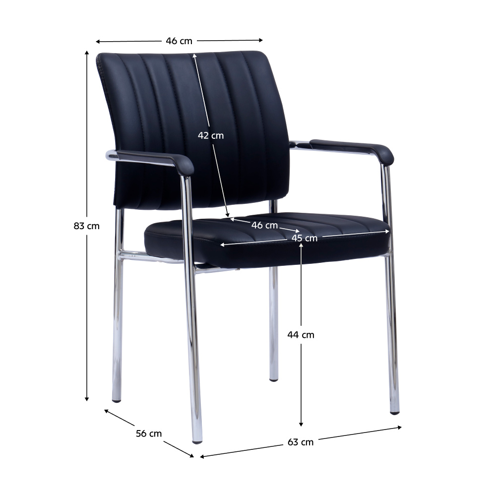 Materiál: ekokůže/kov Oděruodolnost textilie podle testu Martindale: 100 000 oděrů Barva: černá/chrom Rozměry (ŠxHxV): 63x56x83 cm Výška sedu: 44 cm Hloubka sedu: 46 cm Šířka sedu: 45 cm Šířka zádové opěrky: 46 cm Výška zádové opěrky: 42 cm Nosnost: 100 kg Chromová podstava Zasedací S opěrkami na ruce Dodáváno v monte