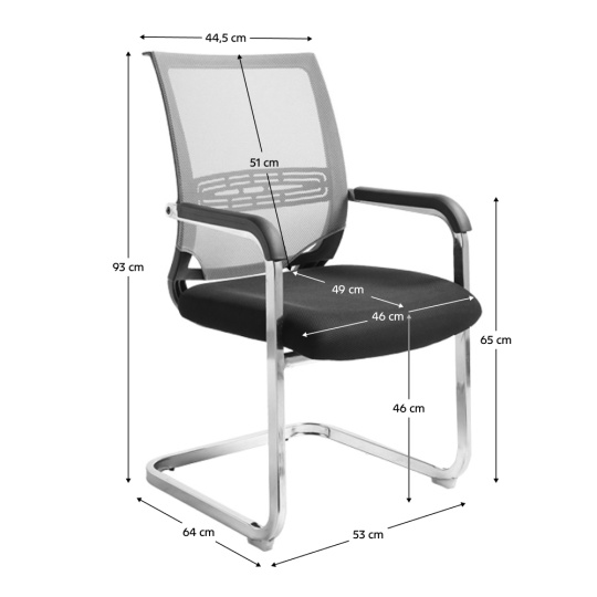 Materiál: síťovina/plast/kov Oděruodolnost textilie podle testu Martindale: 90 000 oděrů Barva: černá/šedá/chrom Rozměry (ŠxHxV): 53x64x93 cm Výška sedu: 46 cm Hloubka sedu: 49 cm Šířka sedu: 46 cm Výška zádové opěrky: 51 cm Šířka zádové opěrky: 44,5 cm Nosnost: 100 kg Chromová podstava Zasedací S plastovými opěrkami na ruce Dodáváno v demontu