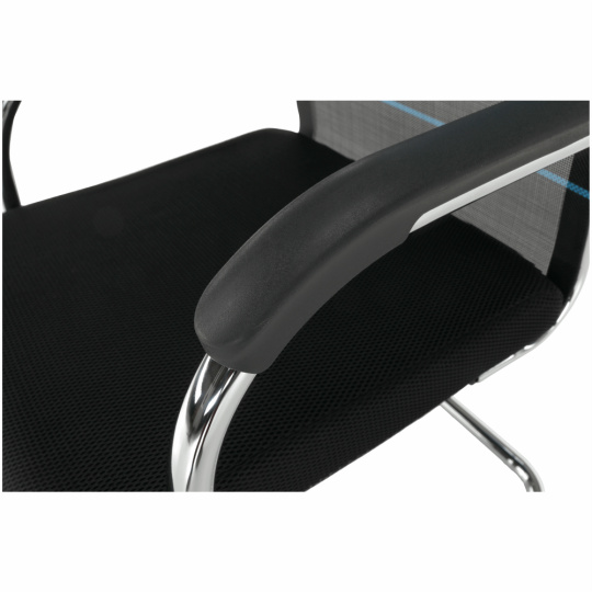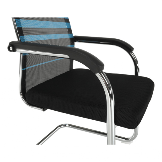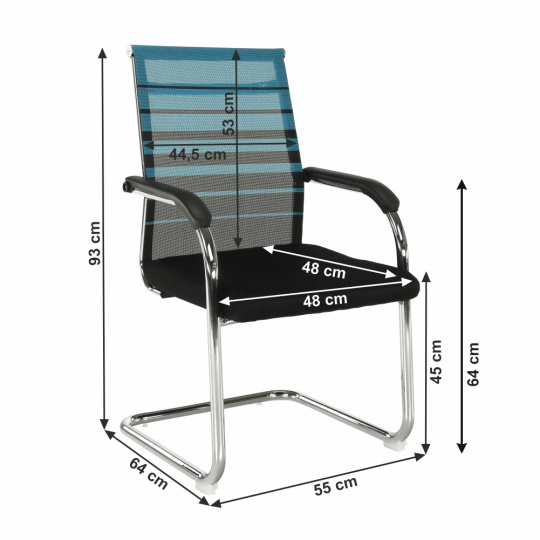 Materiál: síťovina/kov Oděruodolnost textilie podle testu Martindale: 90 000 oděrů Barva: modrá/černá/chromová Rozměry (ŠxHxV): 55x64x93 cm Výška sedu: 45 cm Hloubka sedu: 48 cm Šířka sedu: 48 cm Šířka zádové opěrky: 44,5 cm Výška zádové opěrky: 53 cm Výška od země po vrch opěrky na ruce: 64cm Nosnost: 100 kg Plastové opěrky na ruce Pevná konstrukce Do zasedaček a jednacích místností Dodáváno v demontu