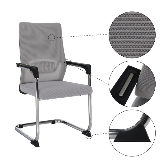 Materiál čalounění: síťovina/plast/kov Oděruodolnost textilie podle testu Martindale: 90 000 oděrů Barva: šedá/černá Materiál konstrukce: kov Barva: chromová povrchová úprava Rozměry (ŠxHxV): 57x62x100 cm Výška sedu: 45 cm Hloubka sedu: 50 cm Šířka sedu : 49 cm Výška zádové opěrky: 56 cm Šířka zádové opěrky: 44,5 cm Výška od země po opěrku na ruce: 63,5 cm Nosnost: 110 kg Chromová podstava Plastové opěrky na ruce Dodáváno v demontu