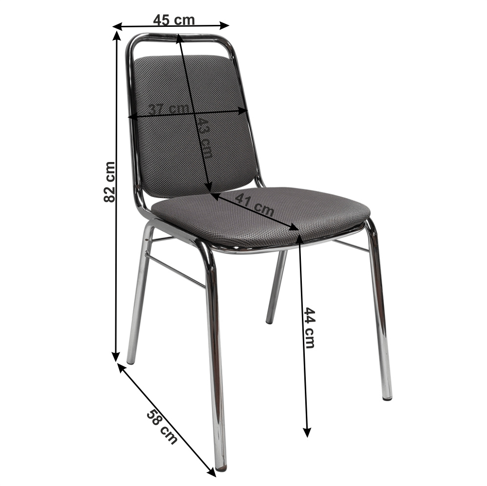 Barva: šedá / chrom Materiál: síťovina / kov Oděruodolnost textilie podle testu Martindale: 90 000 oděrek Rozměry (ŠxHxV): 45x58x82 cm Výška sedu: 44 cm Hloubka sedu: 41 cm Šířka sedu: 40 cm Šířka zádové opěrky: 37 cm Výška zádové opěrky: 43 cm Nosnost: 120 kg stohovatelná Dodávané v monte.