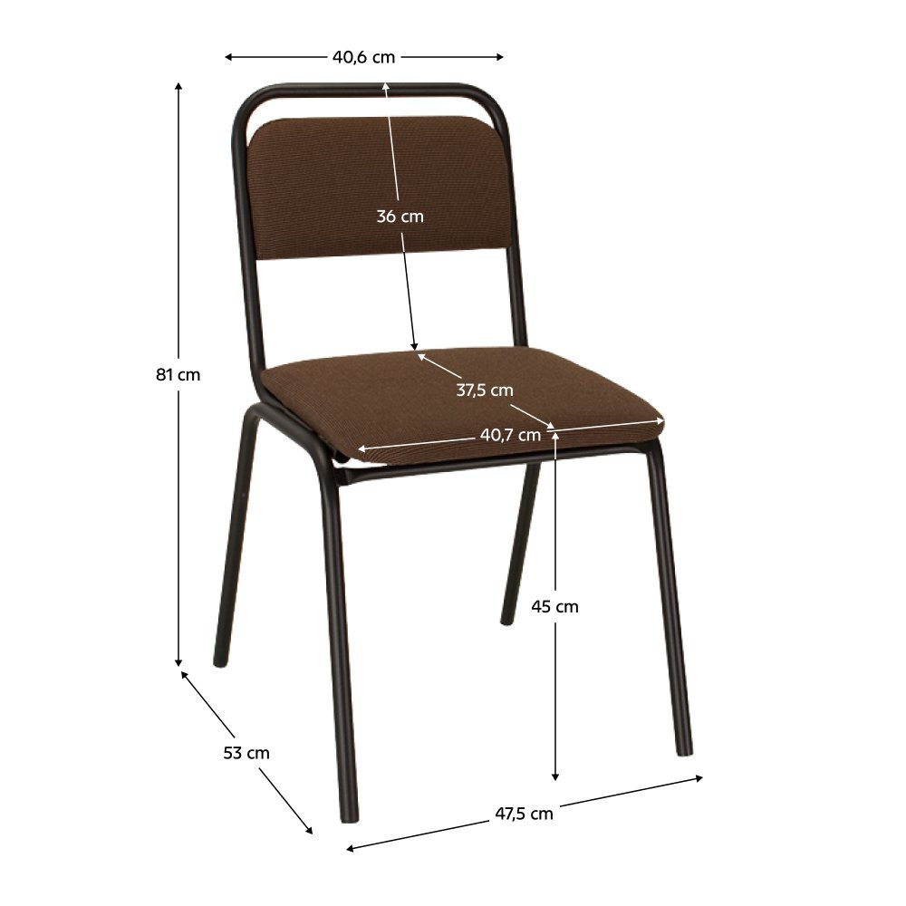 Materiál: látka/kov Oděruodolnost textilie podle testu Martindale: 80 000 oděrů Barva: hnědá/černá Rozměry (ŠxHxV): 47,5x53x81 cm Výška sedu: 45 cm Hloubka sedu: 37,5 cm Šířka sedu: 40,7 cm Výška zádové opěrky: 36 cm Šířka zádové opěrky: 40,6 cm Nosnost: 100 kg Stohovatelná Zasedací Dodáváno v monte
