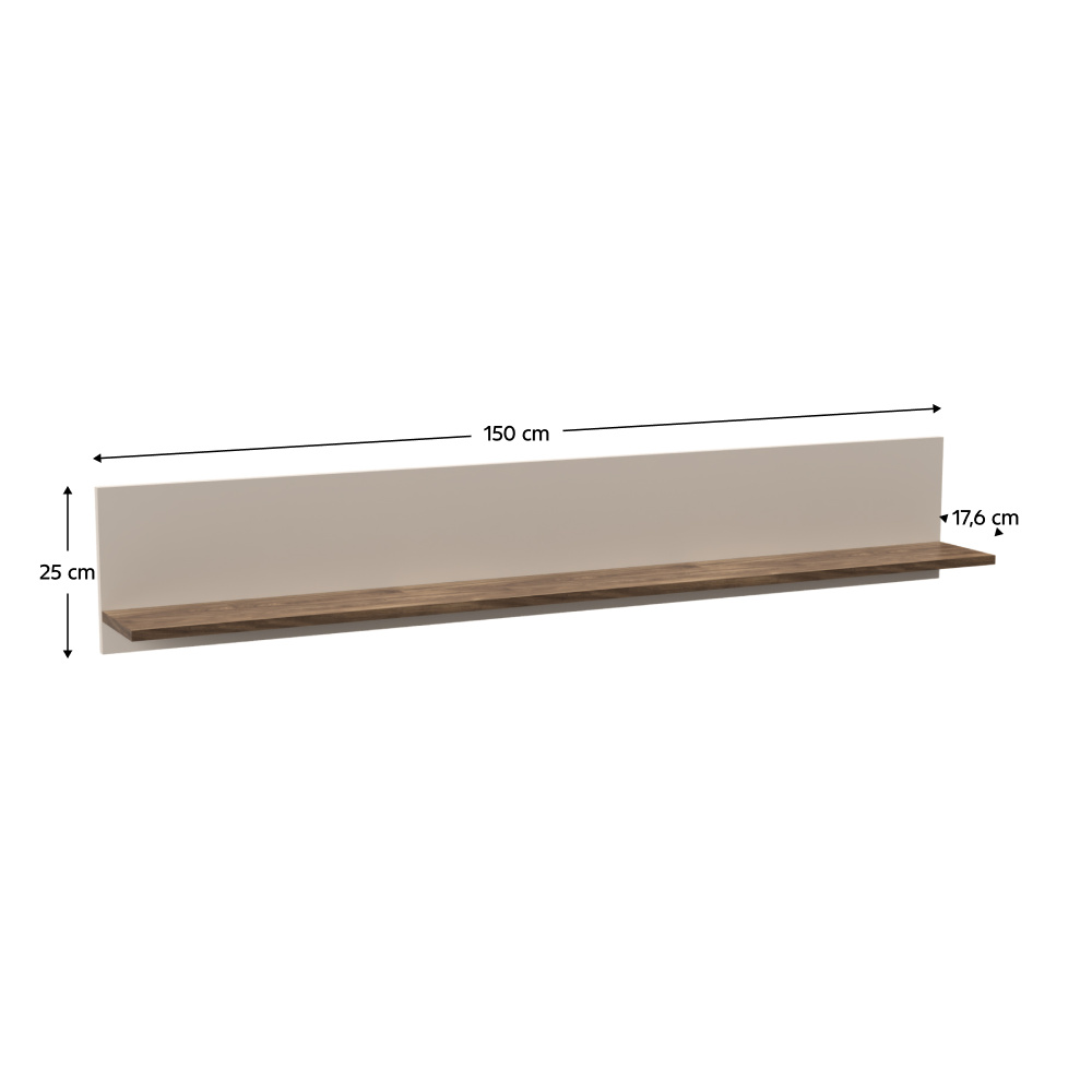 Materiál: laminovaná DTD/ABS hrany Barva: kašmír/dub castello Rozměry (ŠxHxV): 150x17,6x25 cm Tloušťka materiálu: 1,6 cm Otevřený úložný prostor Závěsná Nosnost: 5 kg Moderní design Doporučujeme připevnit ke zdi Dodáváno v demontu