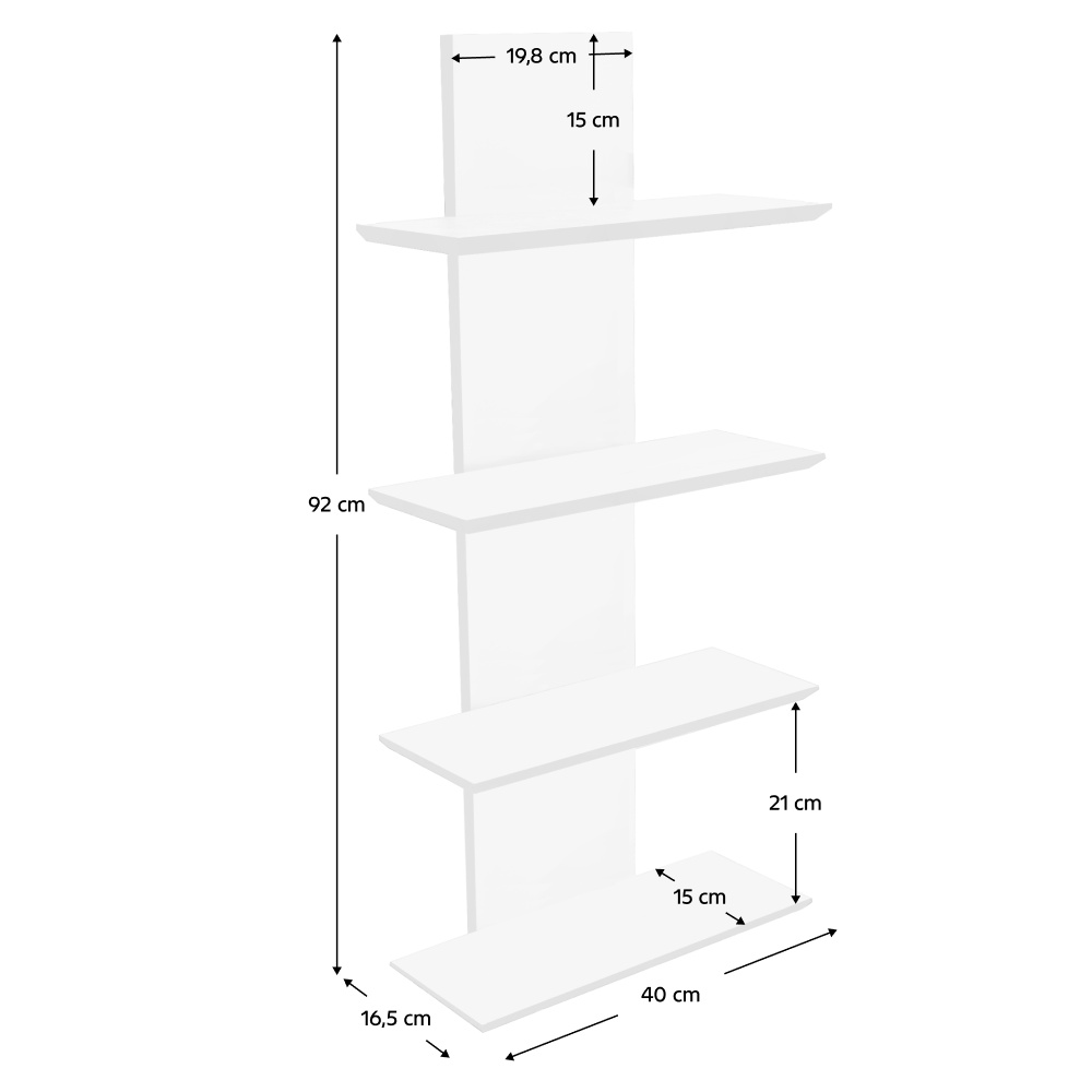 Materiál: laminovaná DTD Barva: bílá Rozměry (ŠxHxV): 40x16,5x92 cm Tloušťka MDF: 1,5 cm Nosnost police: 5 kg Hmotnost: 4,3 kg Nástěnná Závěsná Otevřený úložný prostor Police Rozměry police (ŠxH): 40x15 cm Moderní Doporučujeme připevnit ke zdi Dodáváno v demontu