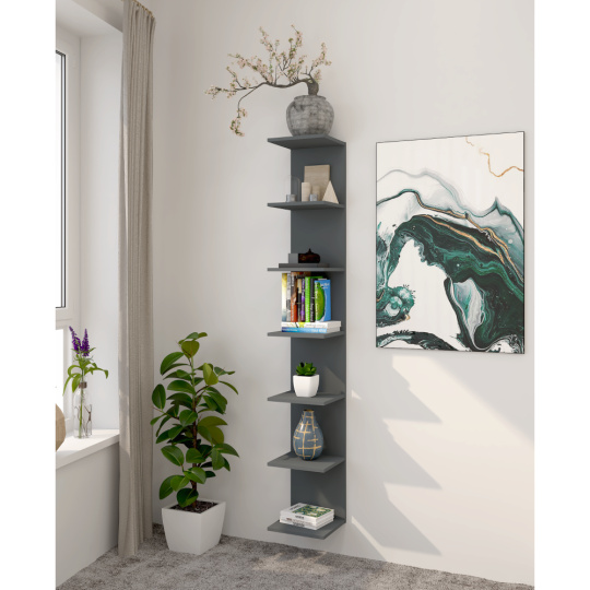 Materiál: laminovaná DTD Barva: grafit Rozměry (ŠxHxV): 30x28x190 cm Tloušťka materiálu: 1,6 cm Hmotnost: 13,5 kg Nosnost police: 3 kg Nástěnná Závěsná Otevřený úložný prostor Police Rozměry police (ŠxH): 29,8x26,4 cm Výška mezi policemi: 29,8 cm Moderní Doporučujeme připevnit ke stěně Kvalitní slovenský výrobek Dodáváno v demontu
