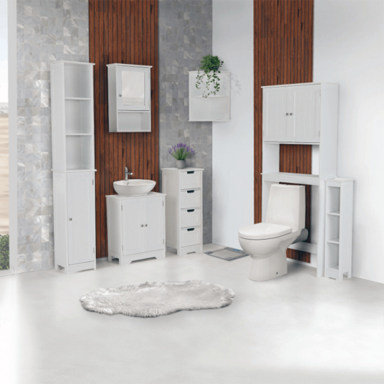 ATENE TYP 5 skříňka nad WC Barevné provedení bílá, Materiál: lakovaná MDF Rozměry (ŠxHxV): 65x22,5x155 cm Výška od podlahy po polici: 75 cm Tloušťka materiálu: 12 mm Dodávané v demontu. Hmotnost: 16.3kg