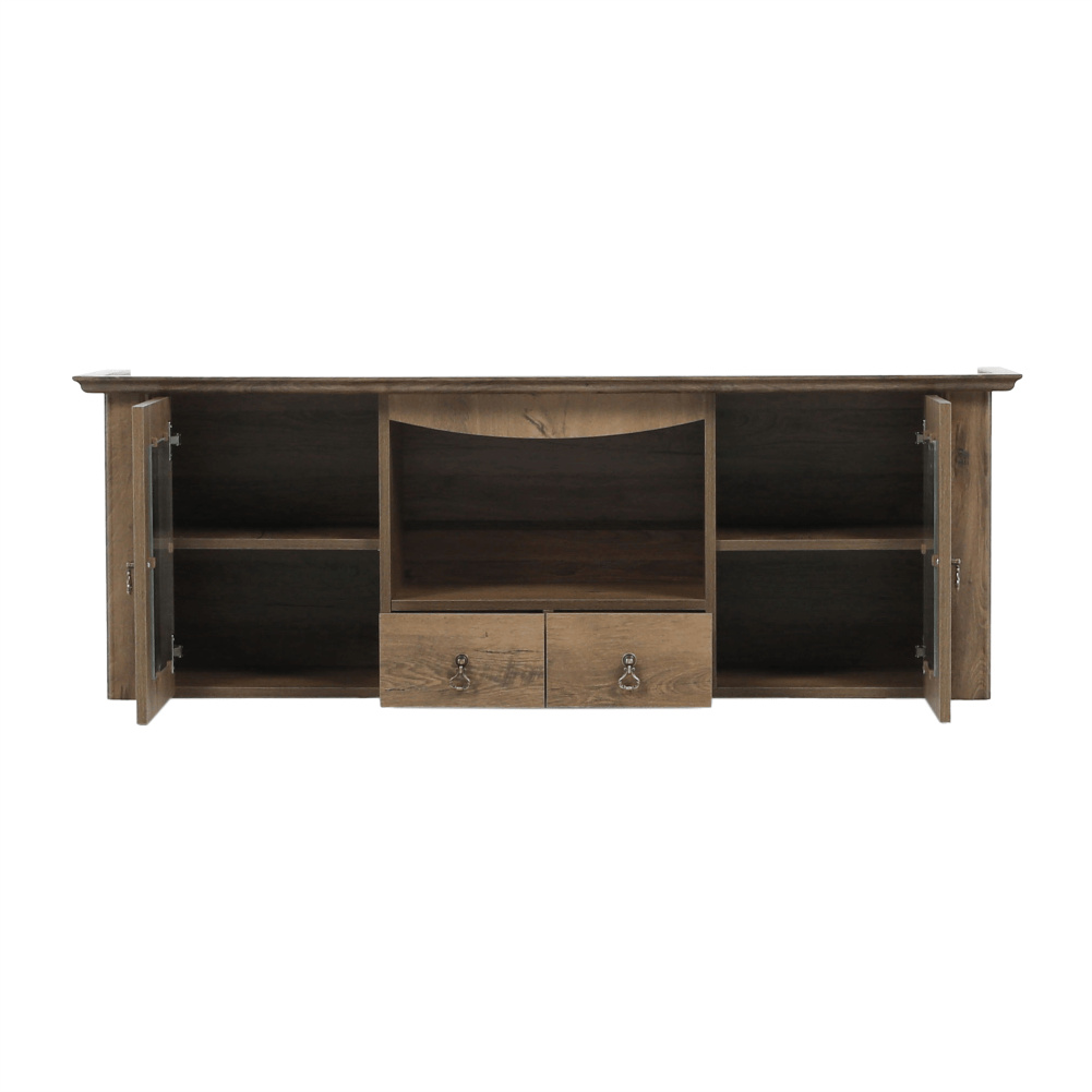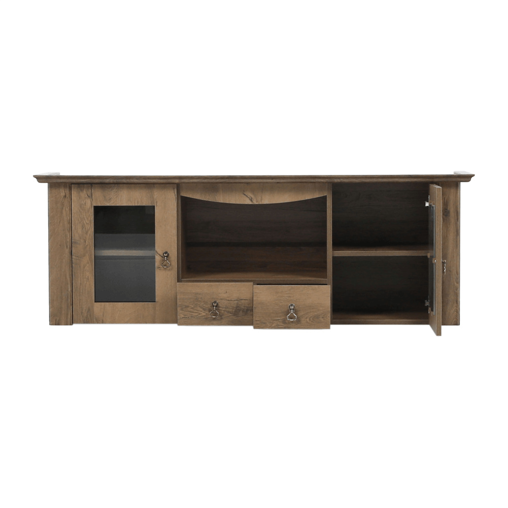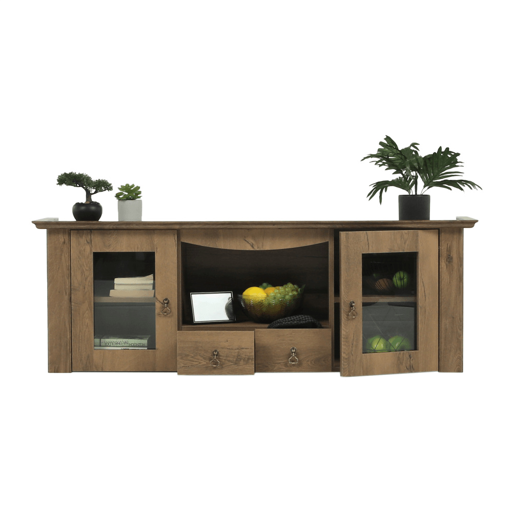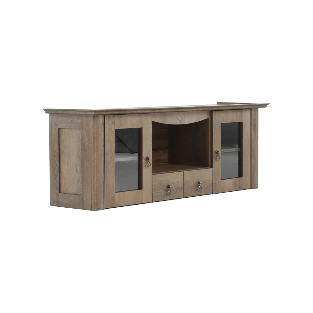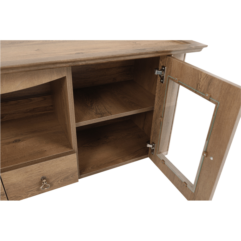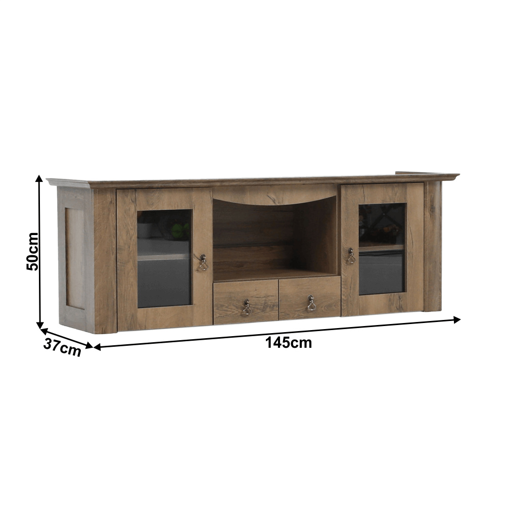 Materiál: DTD laminovaná / ABS hrany Barva: dub lefkas Rozměry (ŠxHxV): 165x42x106 cm Tloušťka materiálu: 30 mm dvě skříňky otevřené police čtyři šuplíky 3D efekt kovové úchytky ABS hrany barokní styl