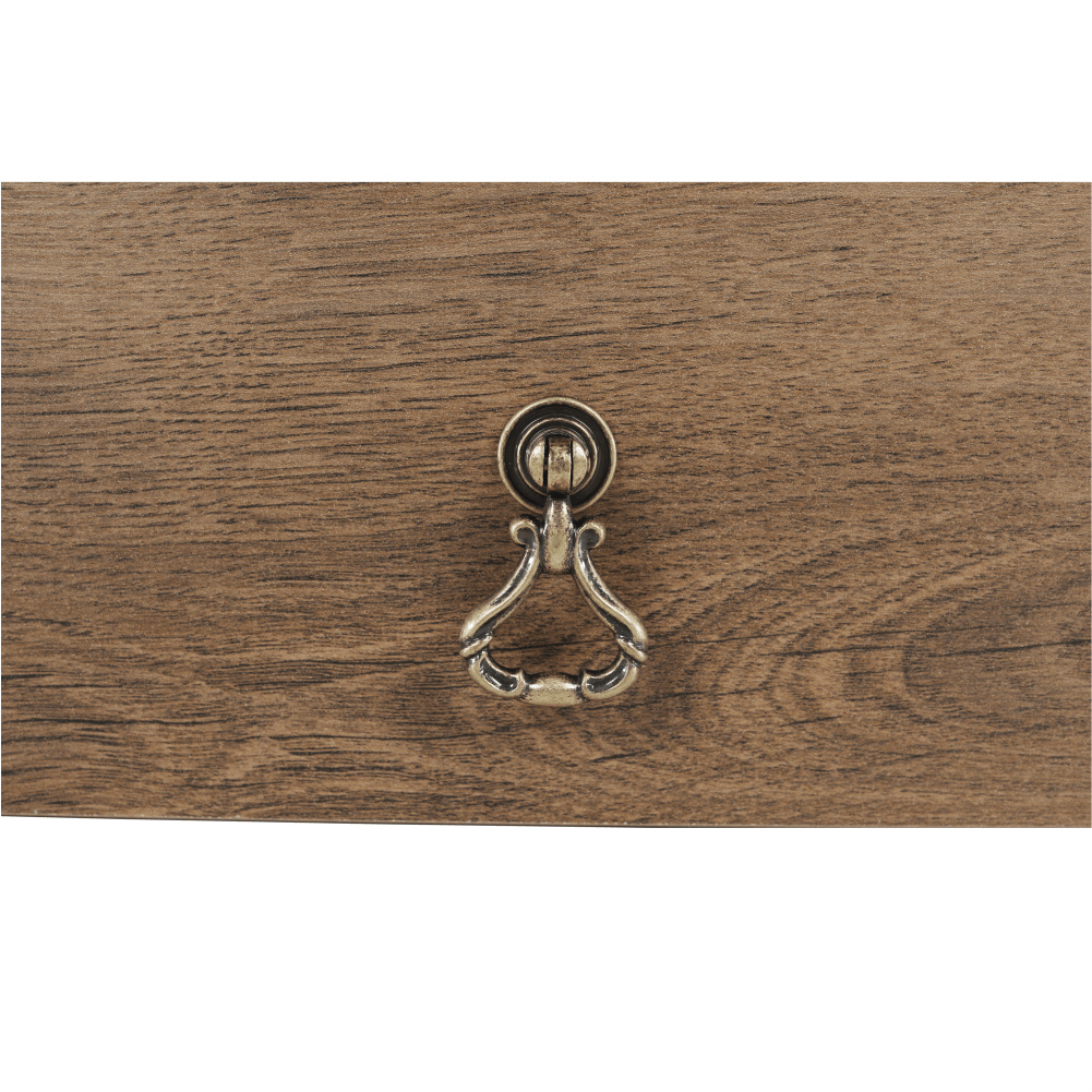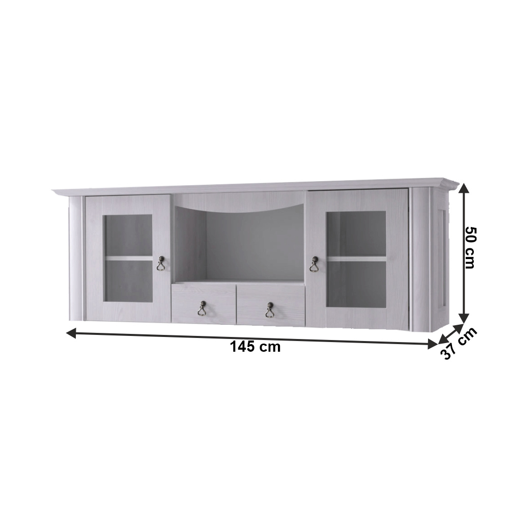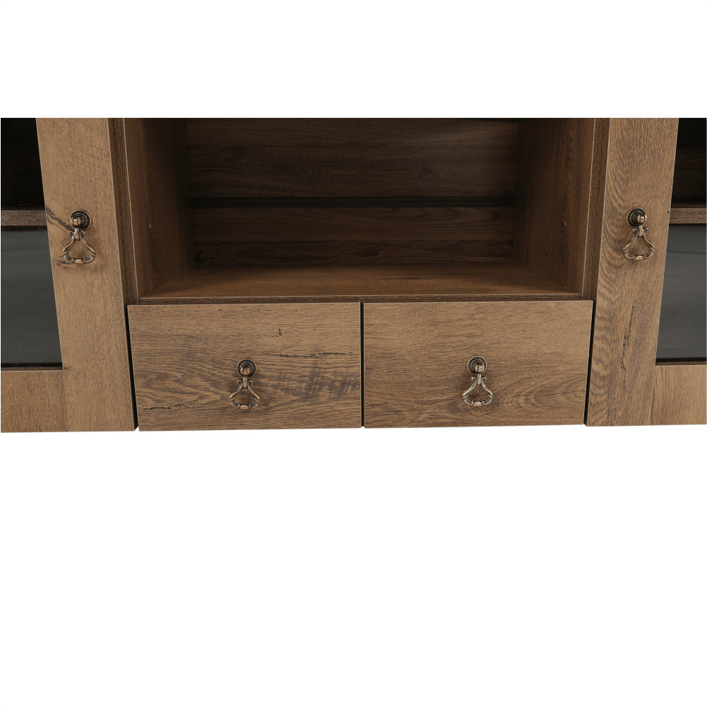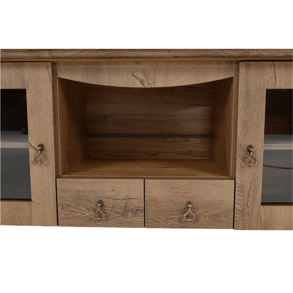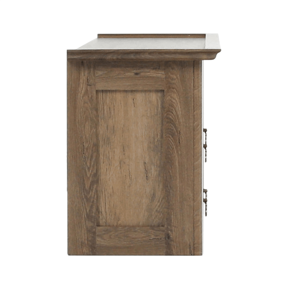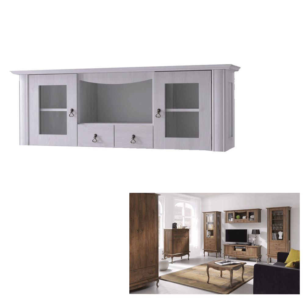 Materiál: DTD laminovaná / ABS hrany Barva: dub lefkas Rozměry (ŠxHxV): 165x42x106 cm Tloušťka materiálu: 30 mm dvě skříňky otevřené police čtyři šuplíky 3D efekt kovové úchytky ABS hrany barokní styl