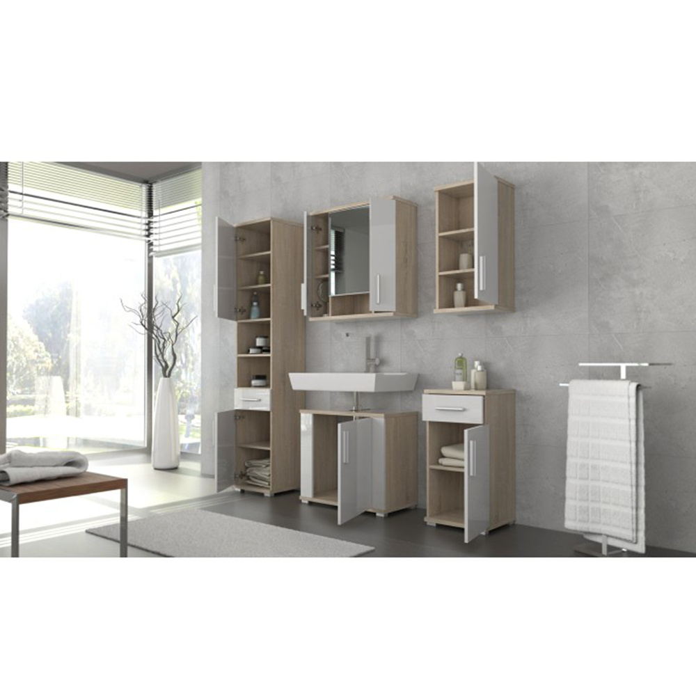 Materiál: DTD laminovaná/sklo Barva: dub sonoma/matná bílá Rozměry (ŠxHxV): 68,7x26x72 cm Tloušťka materiálu: 1,6 cm Plastové úchytky Barva úchytek: šedá 2dveřová Se zrcadlem Rozměr zrcadla (ŠxV): 35x54,5 cm Otevřená polička Moderní design Kvalitní slovenský výrobek Dodáváno v demontu