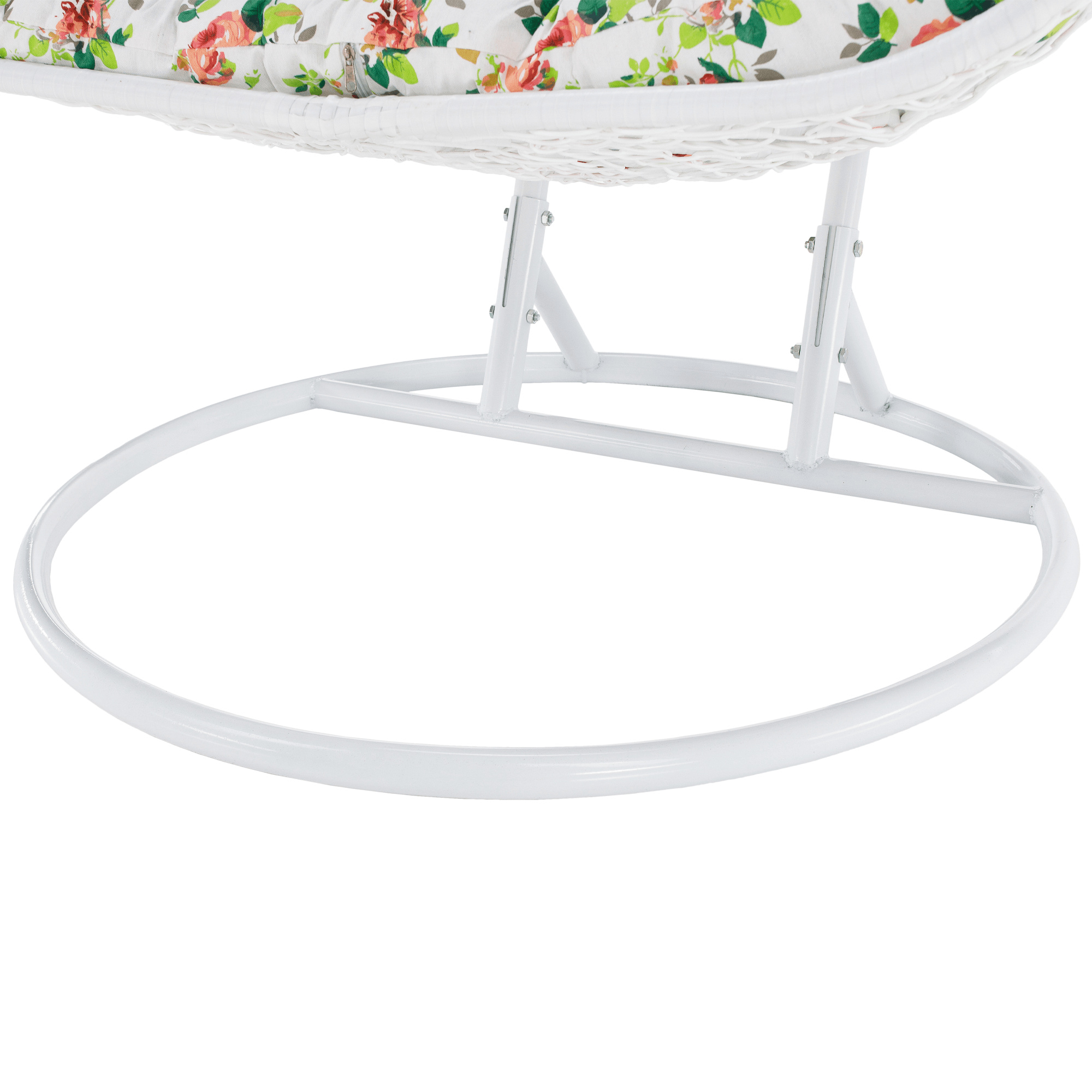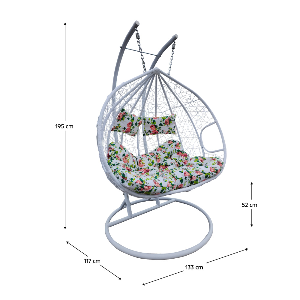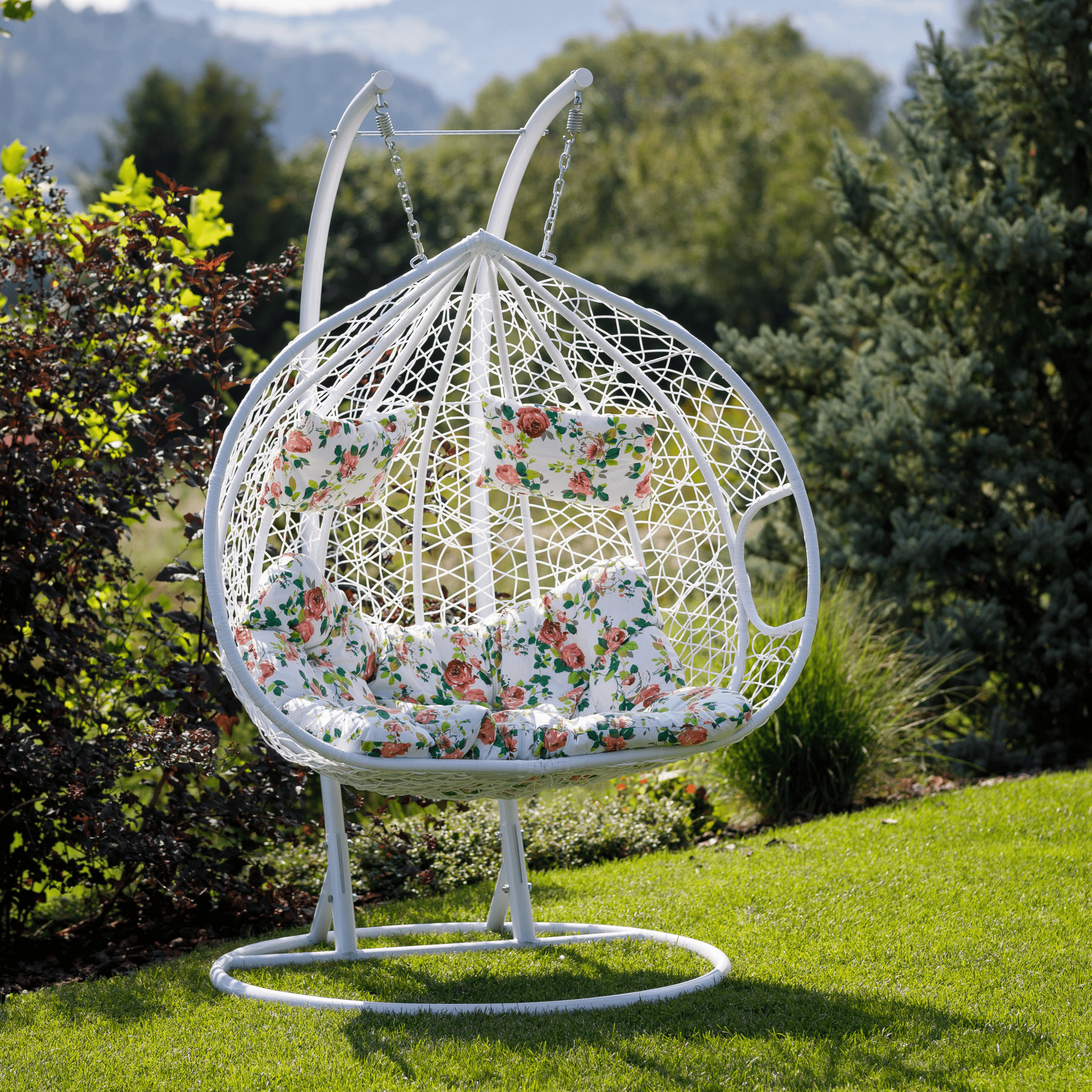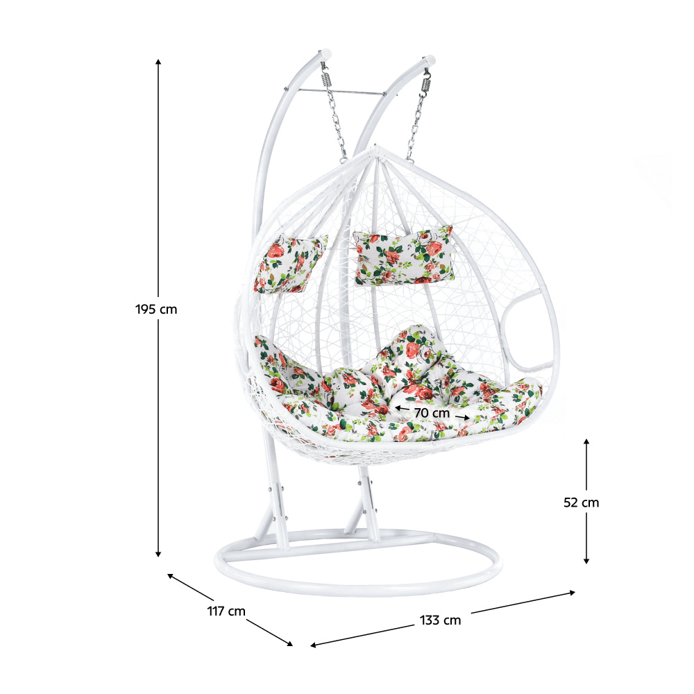 Materiál: kov/umělý ratan/látka Barva: bílá/vzor květiny Rozměry křesla (ŠxHxV): 133x117x195 cm Výška sedu: 52 cm Hloubka sedu: 70 cm Maximální nosnost: 200 kg V exteriéru doporučujeme zajistit křeslo ochranným krytem nebo plachtou Vhodné do interiéru i exteriéru S polštářem Dvojkřeslo Před praním je třeba vyjmout náplň a vyprat jen potah Potah je se zipem Snímatelný potah Pratelný při teplotě do 40 °C Nebělte Nesušit v sušičce Nežehlit Nečistěte chemicky Stojan je součást balení Kování pro závěsné křeslo se nachází přímo v rámu kruhu Dodáváno v demontu