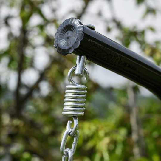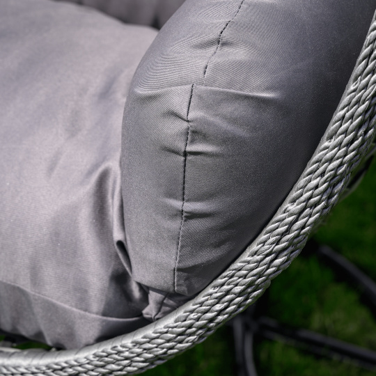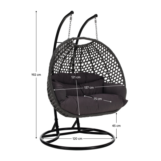 Materiál konstrukce: ocel Barva: černá Materiál křeslo: umělý ratan Barva: šedá Materiál polštáře: látka Barva: tmavě šedá Oděruodolnost textilie podle testu Martindale: 95 000 oděrů Rozměry (ŠxHxV): 137x120x192 cm Rozměry stojan (ŠxHxV): 120x120x192 cm Rozměry křeslo (ŠxHxV): 137x75x121 cm Maximální nosnost: do 200 kg V exteriéru doporučujeme zajistit křeslo ochranným krytem nebo plachtou Dodáváno se stojanem Dodáváno s polštáři Před praním je třeba vyjmout náplň a vyprat jen potah Potah je se zipem Snímatelný potah Pratelný při teplotě do 40 °C Nebělte Nesušit v sušičce Nežehlit Nečistěte chemicky Dodáváno v demontu
