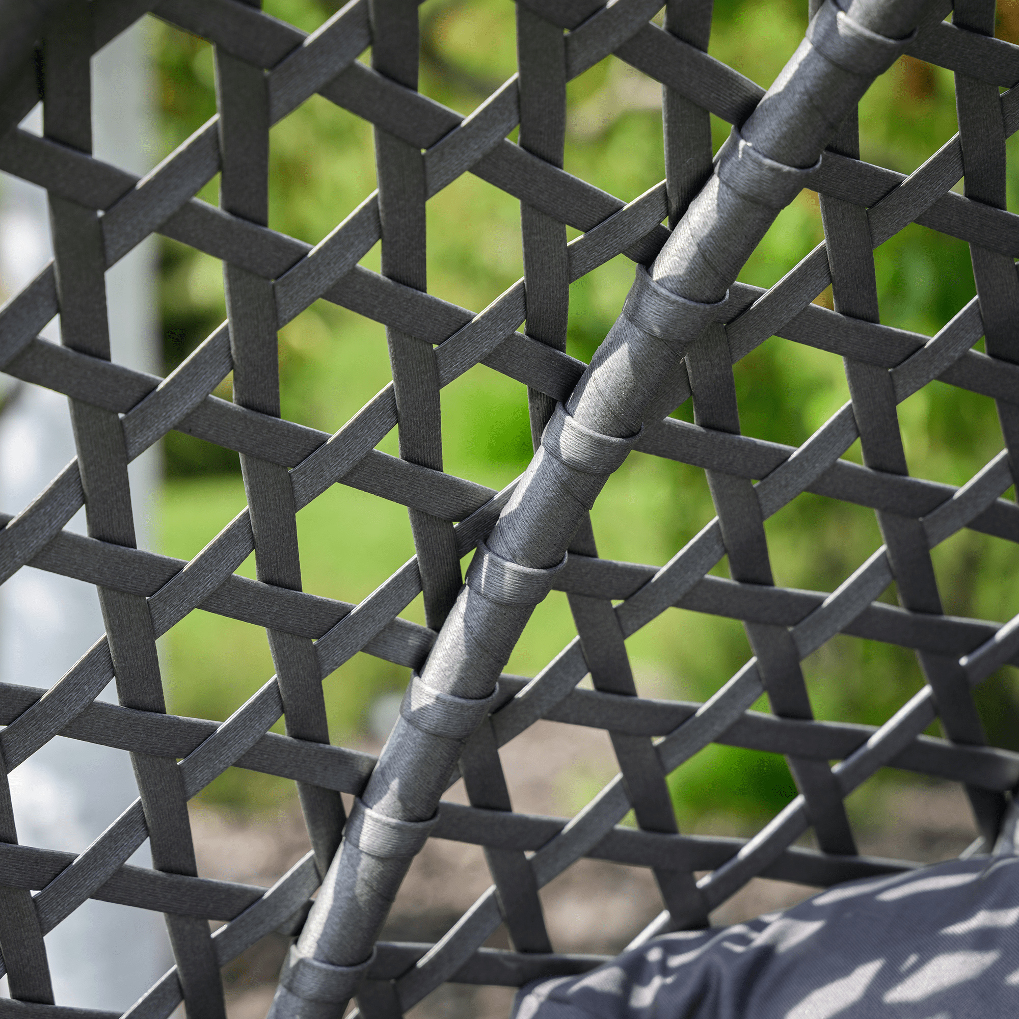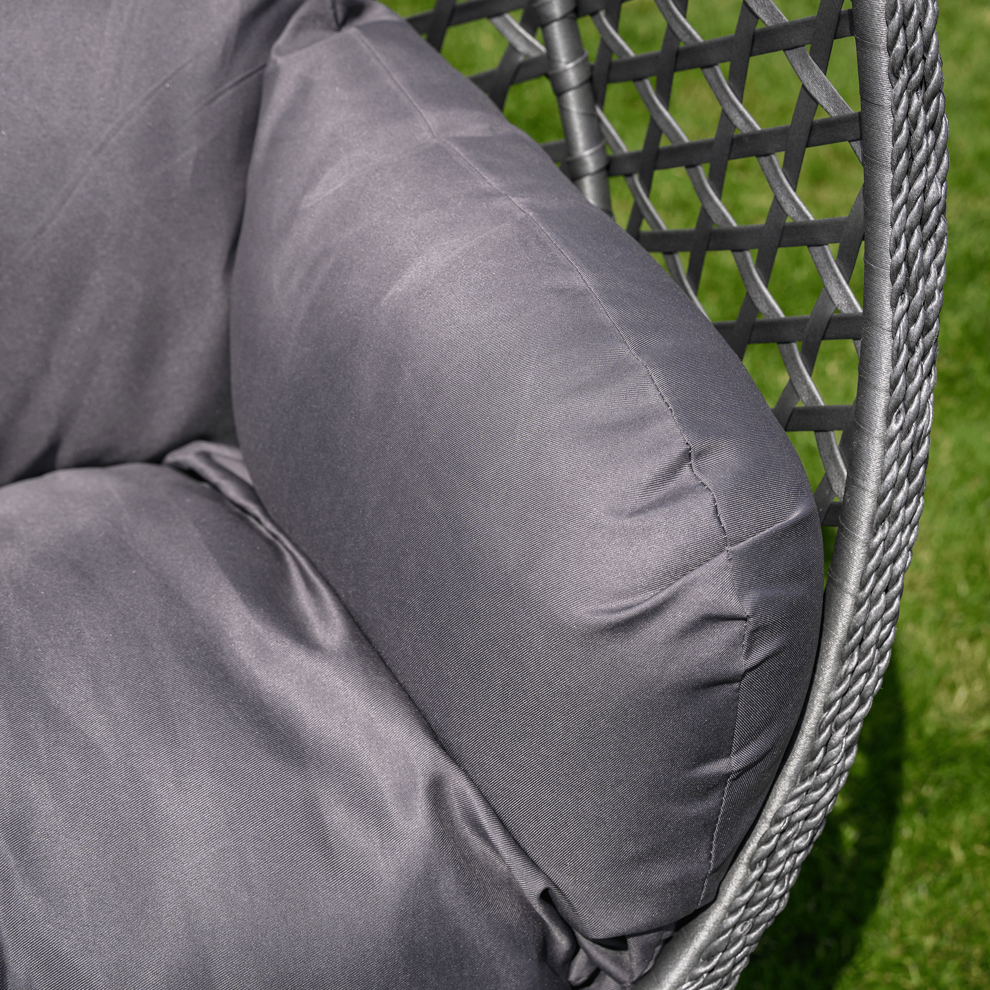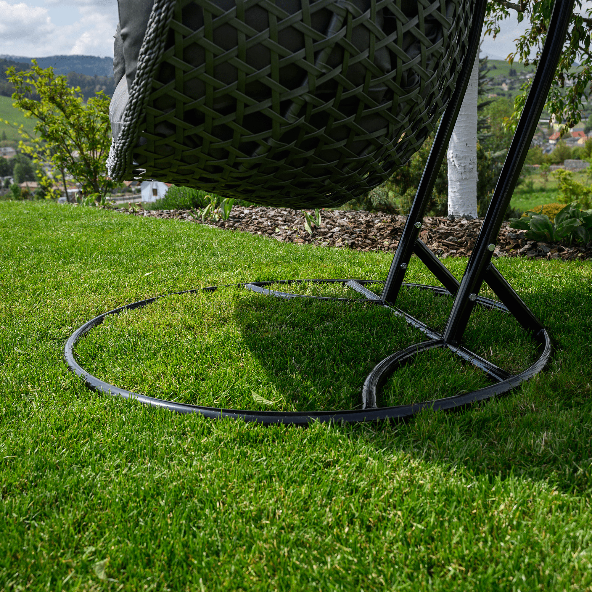 Materiál konstrukce: ocel Barva: černá Materiál křeslo: umělý ratan Barva: šedá Materiál polštáře: látka Barva: tmavě šedá Oděruodolnost textilie podle testu Martindale: 95 000 oděrů Rozměry (ŠxHxV): 137x120x192 cm Rozměry stojan (ŠxHxV): 120x120x192 cm Rozměry křeslo (ŠxHxV): 137x75x121 cm Maximální nosnost: do 200 kg V exteriéru doporučujeme zajistit křeslo ochranným krytem nebo plachtou Dodáváno se stojanem Dodáváno s polštáři Před praním je třeba vyjmout náplň a vyprat jen potah Potah je se zipem Snímatelný potah Pratelný při teplotě do 40 °C Nebělte Nesušit v sušičce Nežehlit Nečistěte chemicky Dodáváno v demontu