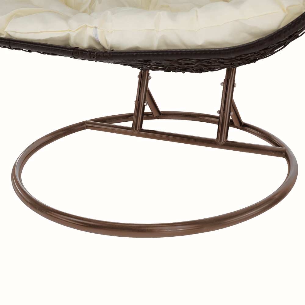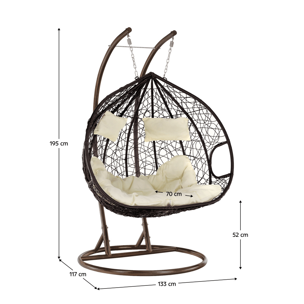 Materiál: kov/umělý ratan/látka Barva: měděná/hnědá/krémová Rozměry křesla (ŠxHxV): 133x117x195 cm Výška sedu: 52 cm Hloubka sedu: 70 cm Maximální nosnost: 200 kg V exteriéru doporučujeme zajistit křeslo ochranným krytem nebo plachtou Vhodné do interiéru i exteriéru S polštářem Před praním je třeba vyjmout náplň a vyprat jen potah Potah je se zipem Snímatelný potah Pratelný při teplotě do 40 °C Nebělte Nesušit v sušičce Nežehlit Nečistěte chemicky Dvojkřeslo Stojan je součást balení Kování pro závěsné křeslo se nachází přímo v rámu kruhu Dodáváno v demontu