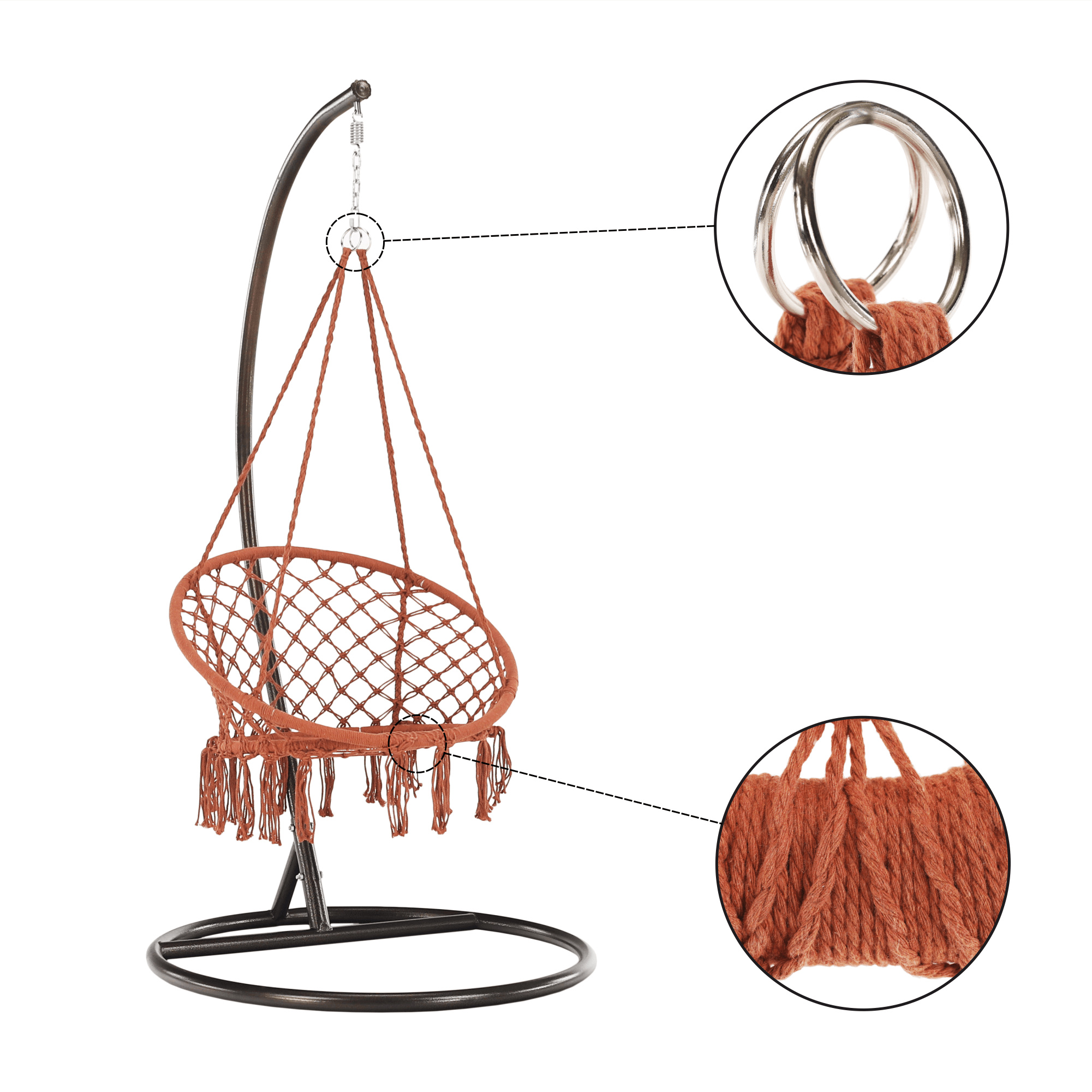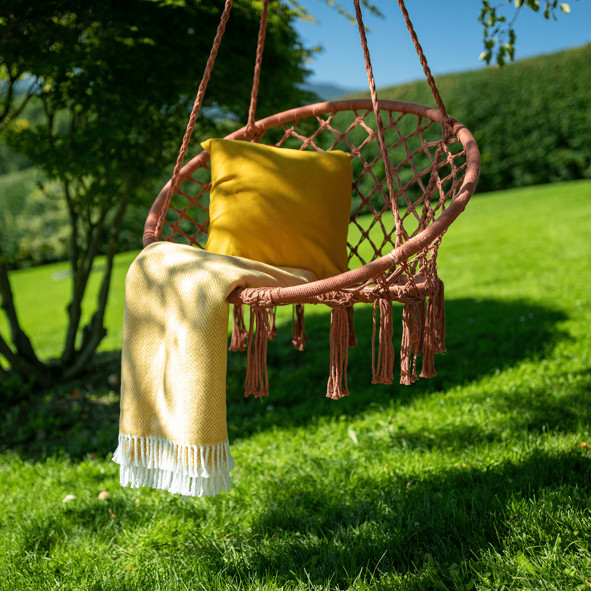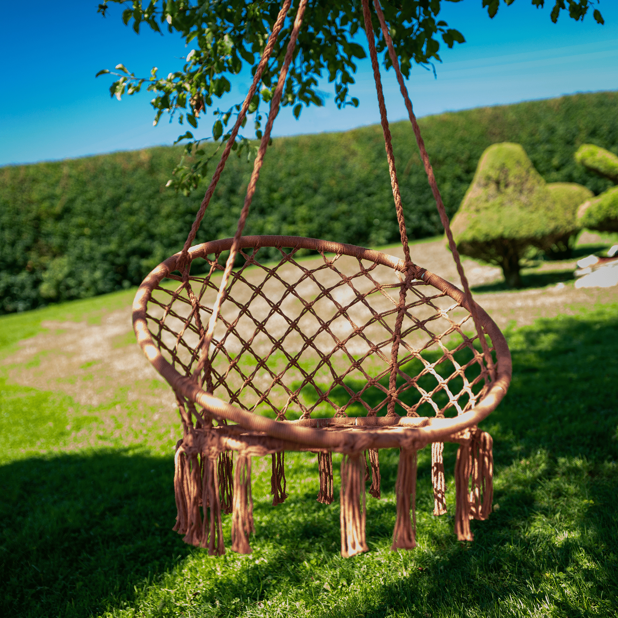 Závěsné křeslo AMADO Materiál: 100% bavlna Provedení: béžová hnedá Rozměry (ŠxHxV): 80x120 cm Průměr ve spodní části: 60 cm Součástí balení jsou 4 závěsné lana Nosnost do 120 kg