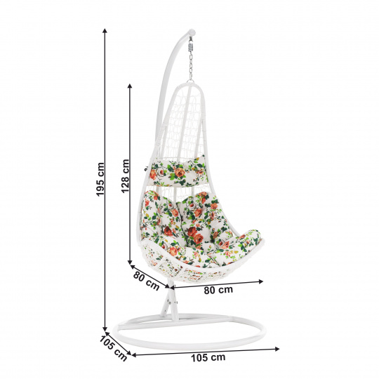 Materiál: ocel/látka/umělý ratan Oděruodolnost textilie podle testu Martindale: 95 000 oděrů Závěsné křeslo KALEA 2 NEW vhodné do exteriéru i interiéru Barevné provedení: bílý rám/bílý ratan/polštář vzor květiny Rozměr se stojanem (ŠxHxV): 105x105x195 cm Rozměry křeslo (ŠxHxV): 80x80x128 cm Výška rámu: 195 cm Maximální nosnost 130 kg V exteriérech doporučujeme křeslo zajistit ochranným potahem nebo plachtou Dodáváno s polštáři Před praním je třeba vyjmout náplň a vyprat jen potah Potah je se zipem Snímatelný potah Pratelný při teplotě do 40 °C Nebělte Nesušit v sušičce Nežehlit Nečistěte chemicky Stojan je součástí balení Kování pro závěsné křeslo se nachází přímo v rámu kruhu Dodáváno v demontu