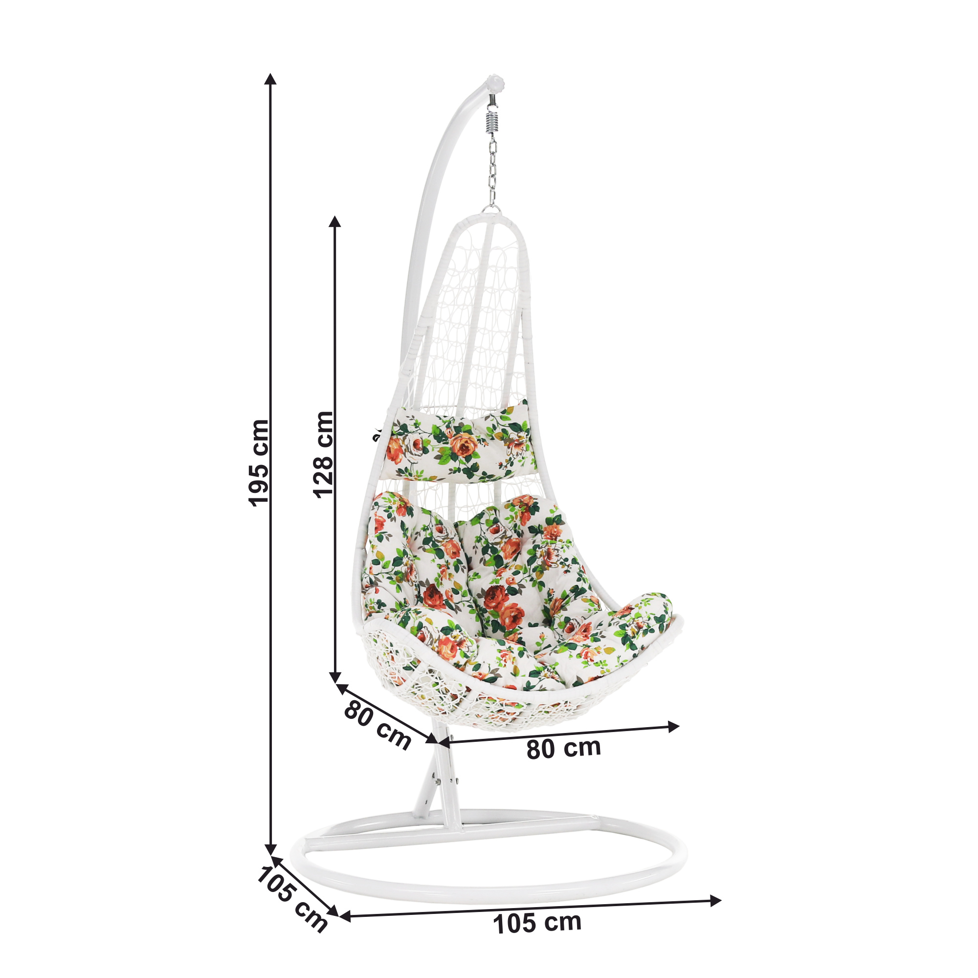 Materiál: ocel/látka/umělý ratan Oděruodolnost textilie podle testu Martindale: 95 000 oděrů Závěsné křeslo KALEA 2 NEW vhodné do exteriéru i interiéru Barevné provedení: bílý rám/bílý ratan/polštář vzor květiny Rozměr se stojanem (ŠxHxV): 105x105x195 cm Rozměry křeslo (ŠxHxV): 80x80x128 cm Výška rámu: 195 cm Maximální nosnost 130 kg V exteriérech doporučujeme křeslo zajistit ochranným potahem nebo plachtou Dodáváno s polštáři Před praním je třeba vyjmout náplň a vyprat jen potah Potah je se zipem Snímatelný potah Pratelný při teplotě do 40 °C Nebělte Nesušit v sušičce Nežehlit Nečistěte chemicky Stojan je součástí balení Kování pro závěsné křeslo se nachází přímo v rámu kruhu Dodáváno v demontu