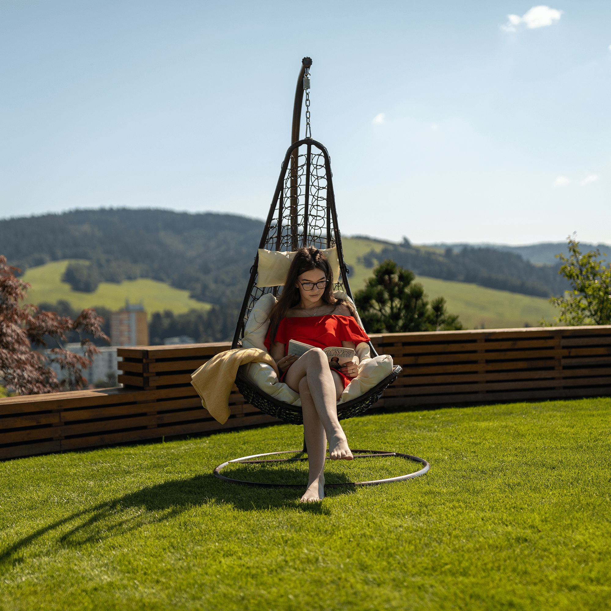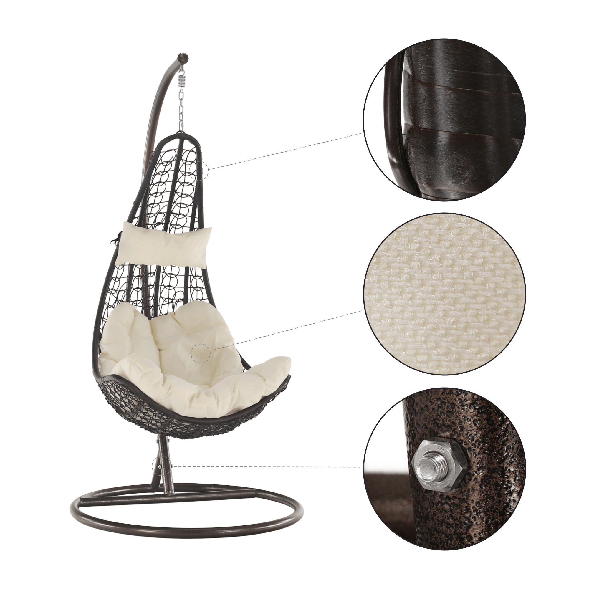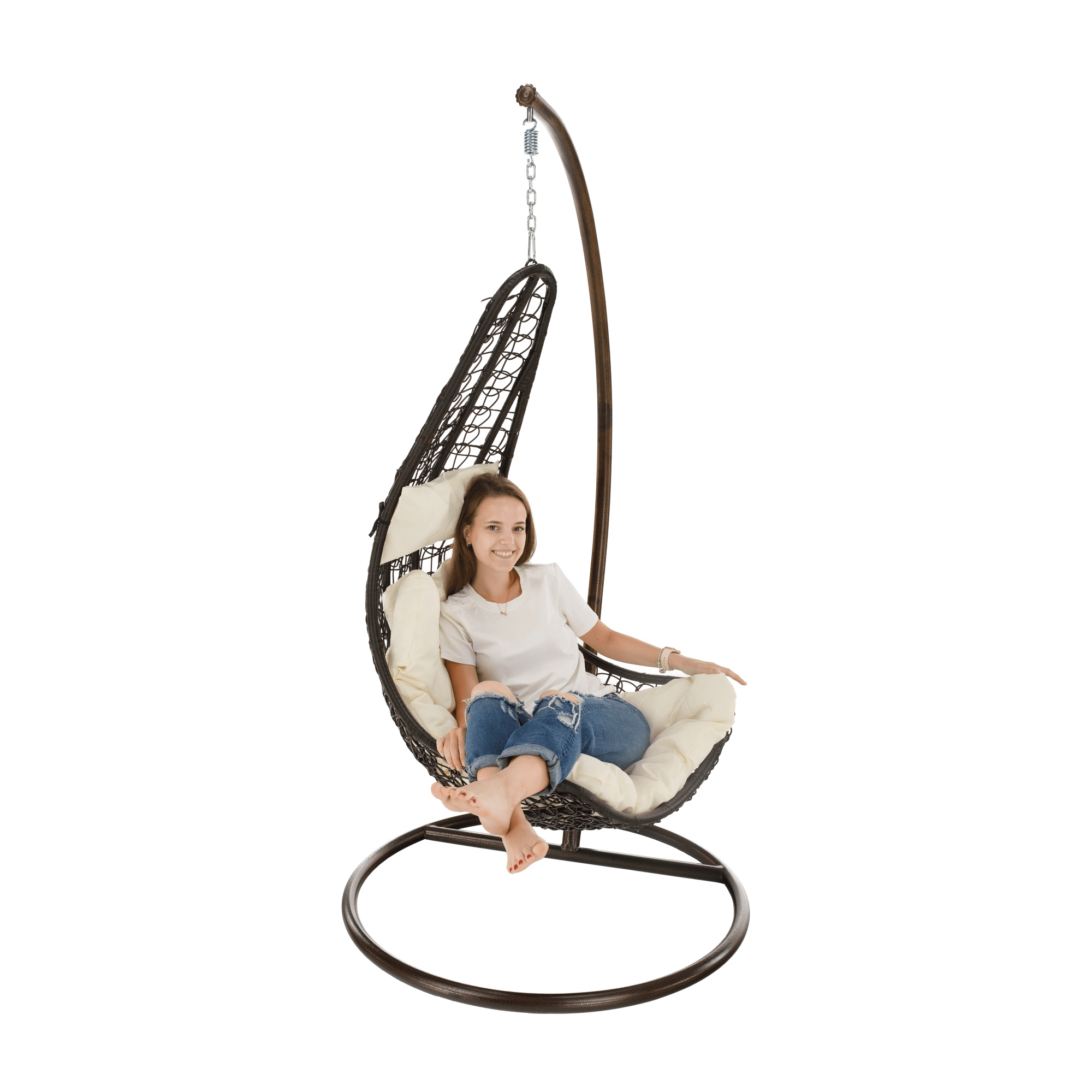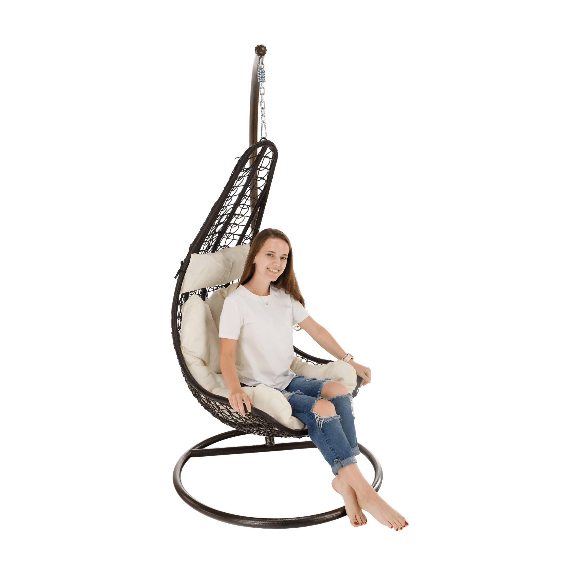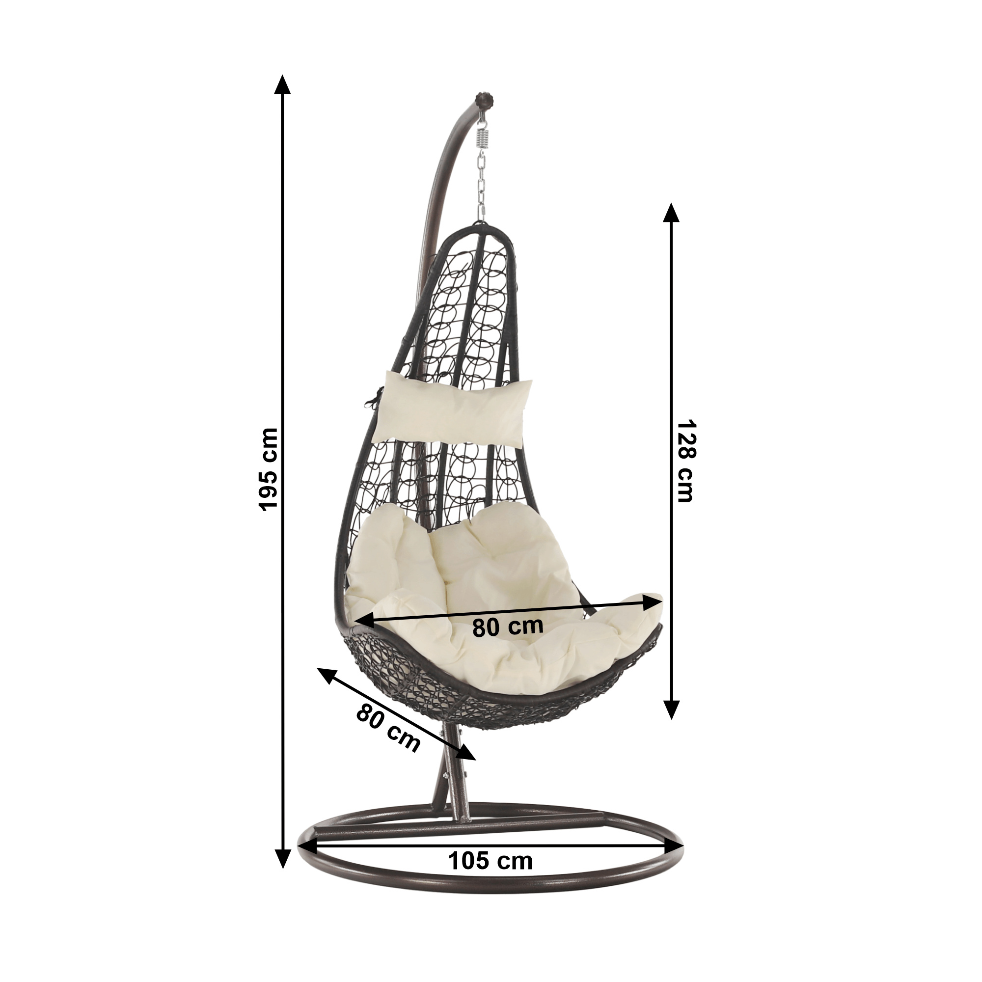 Materiál: ocel / látka / umělý ratan Oděruodolnost textilie podle testu Martindale: 95 000 oděrek Závěsné křeslo Kalea 2 NEW vhodné do exteriéru i interiéru. Barevné provedení: hnědá / krémová Rozměr se stojanem (ŠxHxV): 105x105x195 cm Rozměry křeslo (ŠxHxV): 80x80x128 cm Výška rámu: 195 cm Maximální nosnost 130 kg. V exteriérech doporučujeme křeslo zajistit ochranným potahem nebo plachtou Dodávané s polštáři Před praním je třeba vyjmout náplň a vyprat jen potah Potah je se zipem Snímatelný potah Pratelný při teplotě do 40 °C Nebělte Nesušit v sušičce Nežehlit Nečistěte chemicky Stojan je součástí balení Kování pro závěsné křeslo se nachází přímo v rámu kruhu Dodávané v demontu