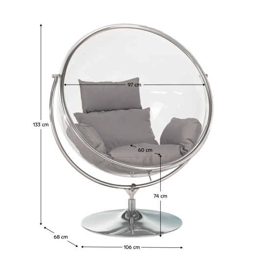 Materiál: nerezavějící ocel/ akryl/látka Oděruodolnost textilie podle testu Martindale: 95 000 oděrů Barva rámu: stříbrná Barva akrylu: transparentní Barva polštáře: šedá Rozměry křesla (ŠxHxV): 106x68x133 cm Vnitřní průměr: 97 cm Hloubka sezení: 60 cm Výška sedu: 74 cm Maximální nosnost: do 100 kg Vhodné do interiéru i exteriéru Křeslo je houpací i otočné Dodáváno s polštářem Polštáře jsou voděodolné Se zipem na spodní straně polštářů Křeslo je dodáváno se stojanem Dodáváno v demontu