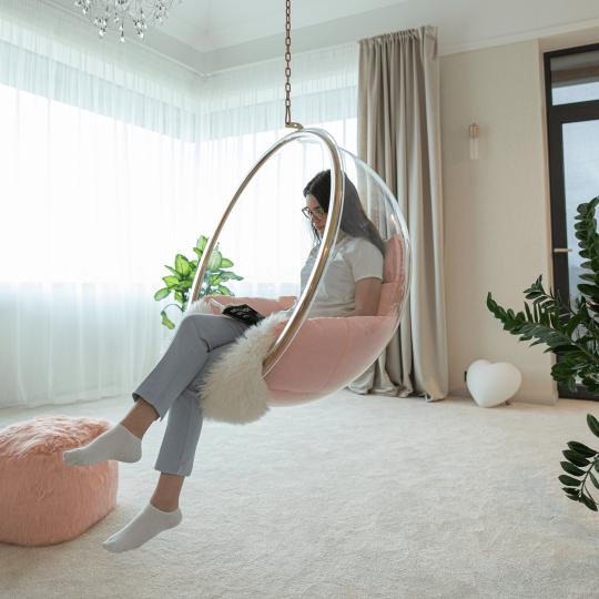 Závěsné křeslo BUBBLE NEW TYP 1 Materiál: nerezavějící ocel/ akryl/látka Oděruodolnost textilie podle testu Martindale: 95 000 oděrů Barva rámu: zlatá Barva akrylu: transparentní Barva polštáře: růžová Rozměry křesla (ŠxHxV): 106x62x106 cm Vnitřní průměr: 97 cm Hloubka sezení: 60 cm Délka řetízku: 200 cm Maximální nosnost: do 100 kg Vhodné do interiéru i exteriéru Dodáváno s polštářem Polštáře nejsou voděodolné Zip na malém polštářku je na zadní straně Dodáváno v monte