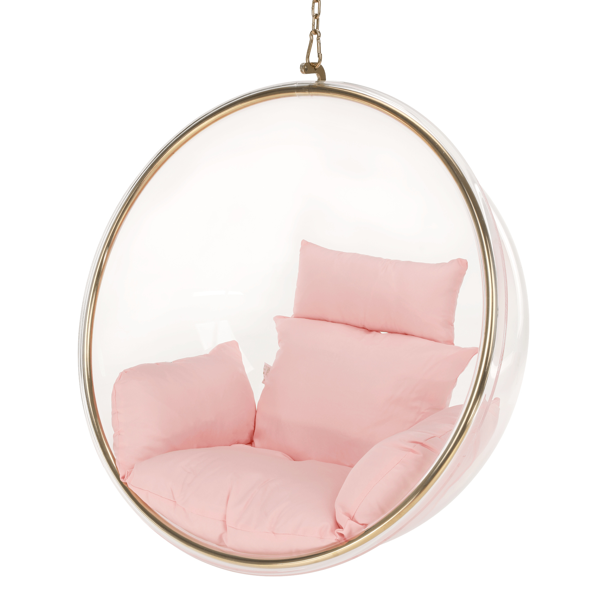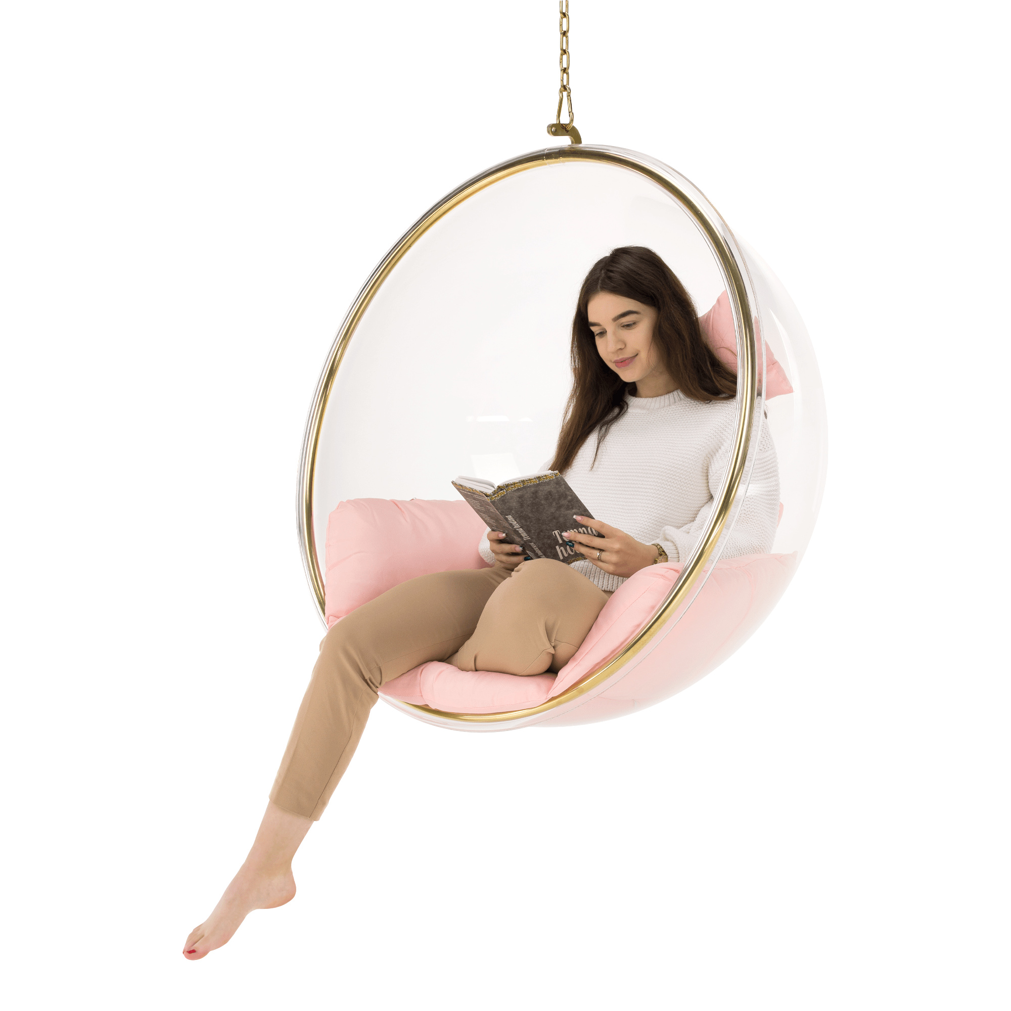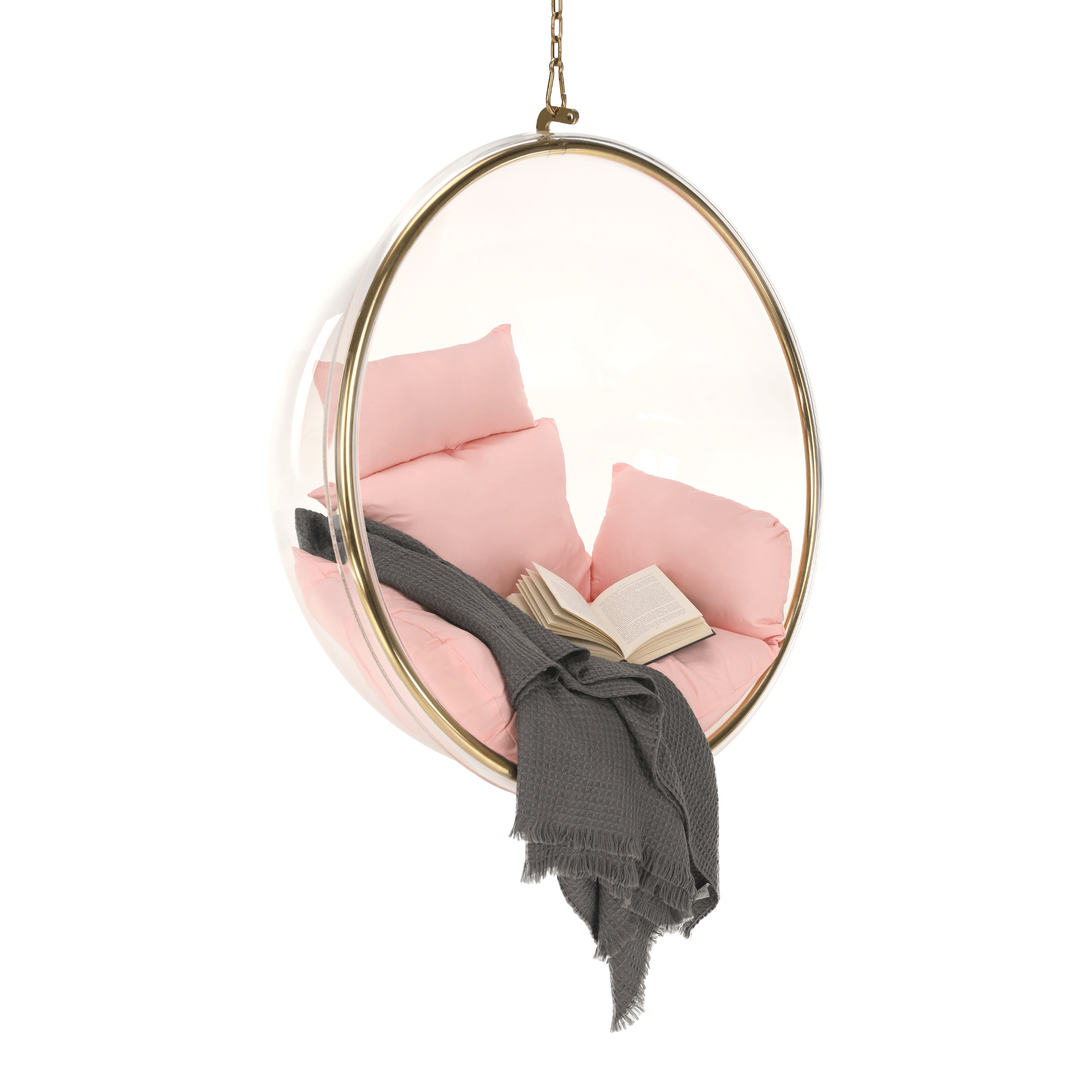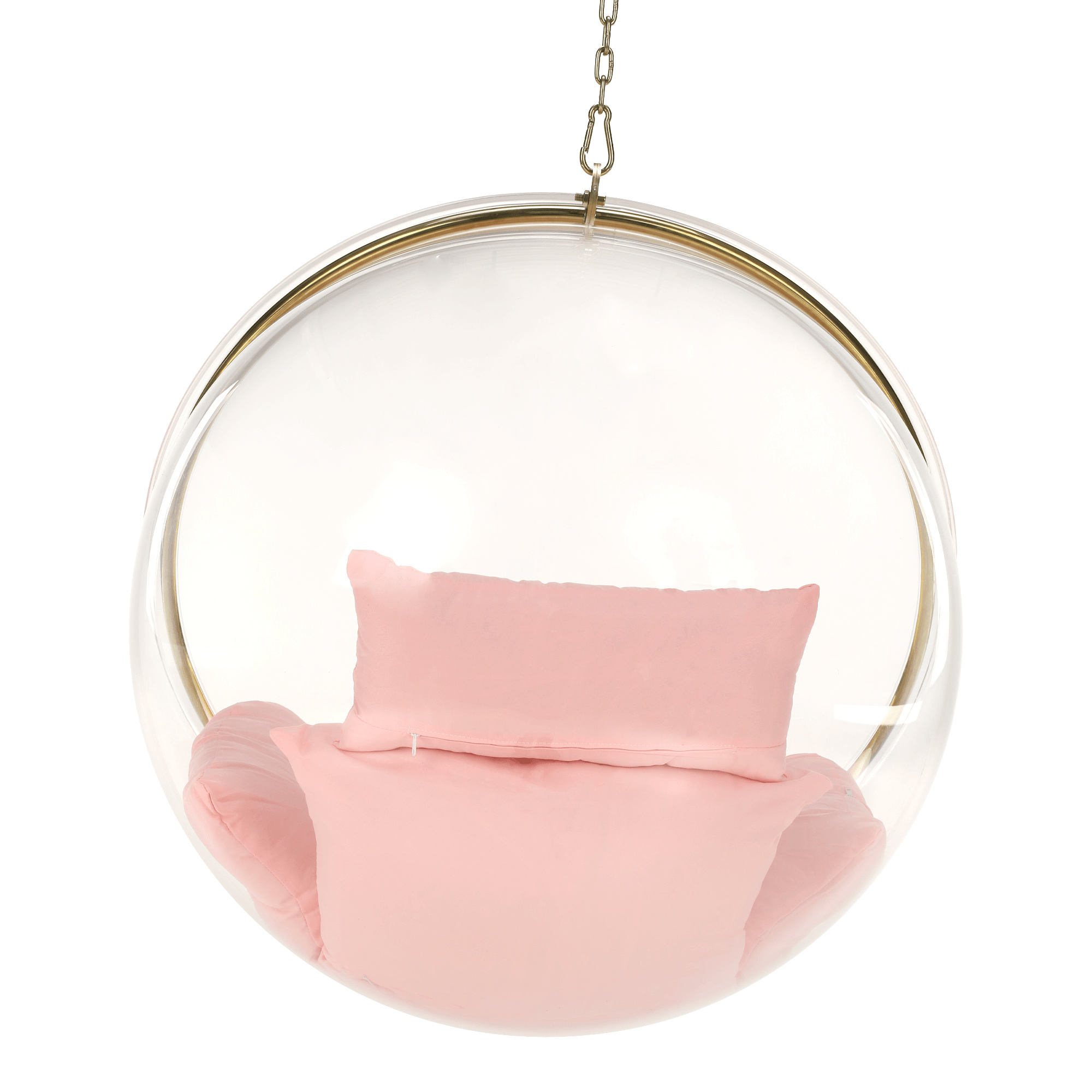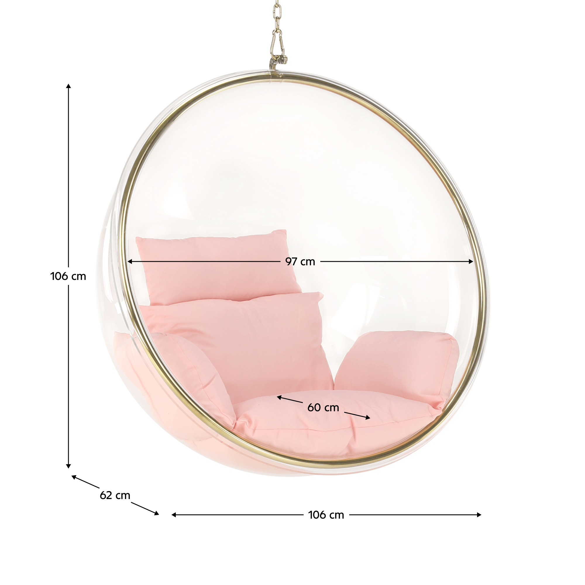Závěsné křeslo BUBBLE NEW TYP 1 Materiál: nerezavějící ocel/ akryl/látka Oděruodolnost textilie podle testu Martindale: 95 000 oděrů Barva rámu: zlatá Barva akrylu: transparentní Barva polštáře: růžová Rozměry křesla (ŠxHxV): 106x62x106 cm Vnitřní průměr: 97 cm Hloubka sezení: 60 cm Délka řetízku: 200 cm Maximální nosnost: do 100 kg Vhodné do interiéru i exteriéru Dodáváno s polštářem Polštáře nejsou voděodolné Zip na malém polštářku je na zadní straně Dodáváno v monte